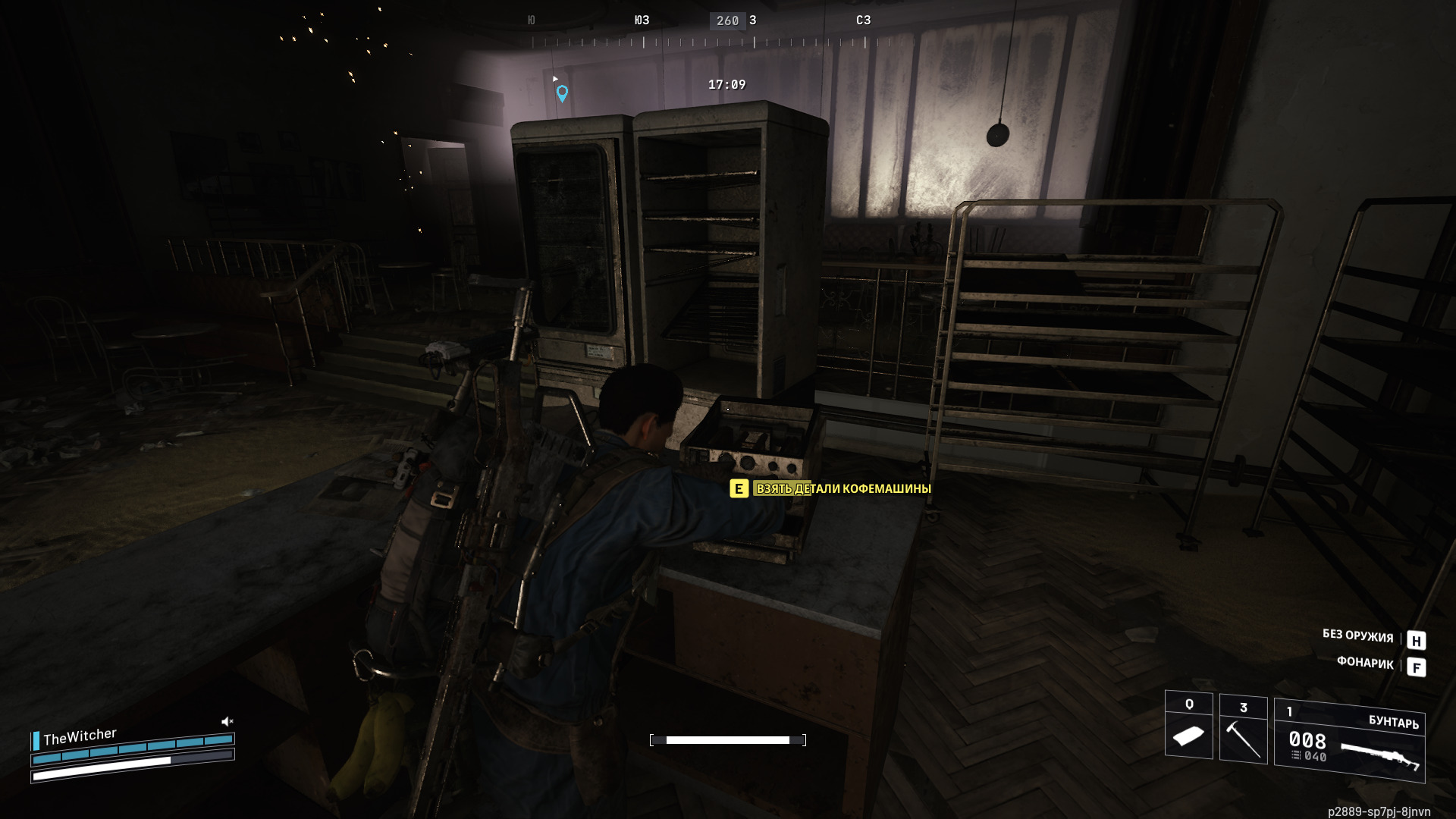 Войдите через дверь сбоку и найдите на стойке стационарную кофемашину. Она будет выделена желтым цветом. Взаимодействуйте и подберите детали, а после успешно эвакуируйтесь.