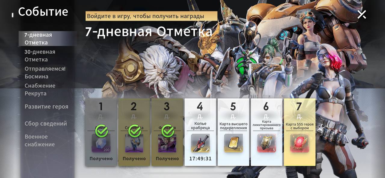 После регистрации обязательно заглядывайте в раздел «События» – там вас ждут ежедневные подарки просто за вход. Если не пропускать дни, можно получить даже SSS-героя. Также обращайте внимание на Босмин: новые задания появляются каждый день, а за их выполнение дают хорошие награды.