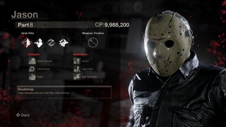 - Джейсон «Часть 8». Рейтинг этого Джейсона полностью связан с его преимуществом в разрушении — способностью уничтожать двери тремя ударами просто восхитительна. Это значит, что вам потребуется меньше времени на то, чтобы пройти через ту или иную дверь и попасть внутрь дома. К преимуществам относится улучшенное выслеживание, а вот недостатки или вовсе несущественные (сила захвата и чувствительность), или отнимают из рейтинга лишь один пункт (уменьшенный бег). Джейсон «Часть 8» имеет более половины потенциала модели «Часть 6» с кумулятивным кулдауном основных умений минута 40 секунд.