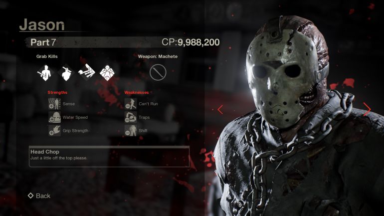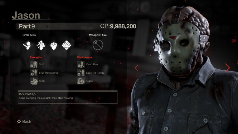 - Джейсон «Часть 9». Главная сила Джейсона «Часть 9» — потенциал его возможностей. Кумулятивный кулдаун его умений составляет минуту 25 секунд, и это лучшее время. Это значит, что этот Джейсон может юзать способности в целом больше, чем все остальные. У него также есть преимущества в улучшенных выслеживании и смещении, чтобы совершать агрессивные и неожиданные захваты. Единственной реальной слабостью является то, что игра начинается с тремя ловушками, а значит, у него меньше возможностей расставить их для защиты целей (машины, телефона). Улучшенное смещение делает его лучшим по сравнению с остальными Джейсонами, но отсутствие хороших свойств для оружия и/или улучшенного разрушения позволяют нам поместить его лишь в середину рейтинга.