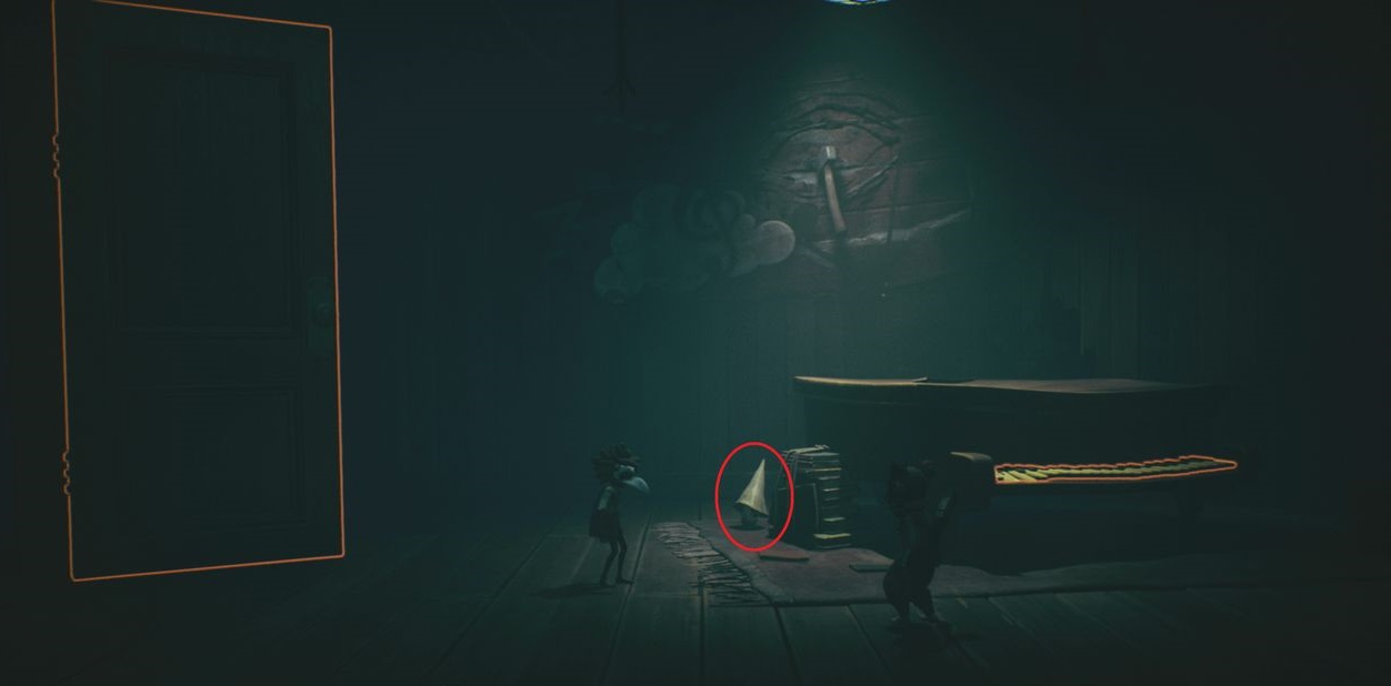 Вернитесь в темный коридор и идите в его конец. Зайдите в правую комнату — рядом с пианино находится Ном №5.