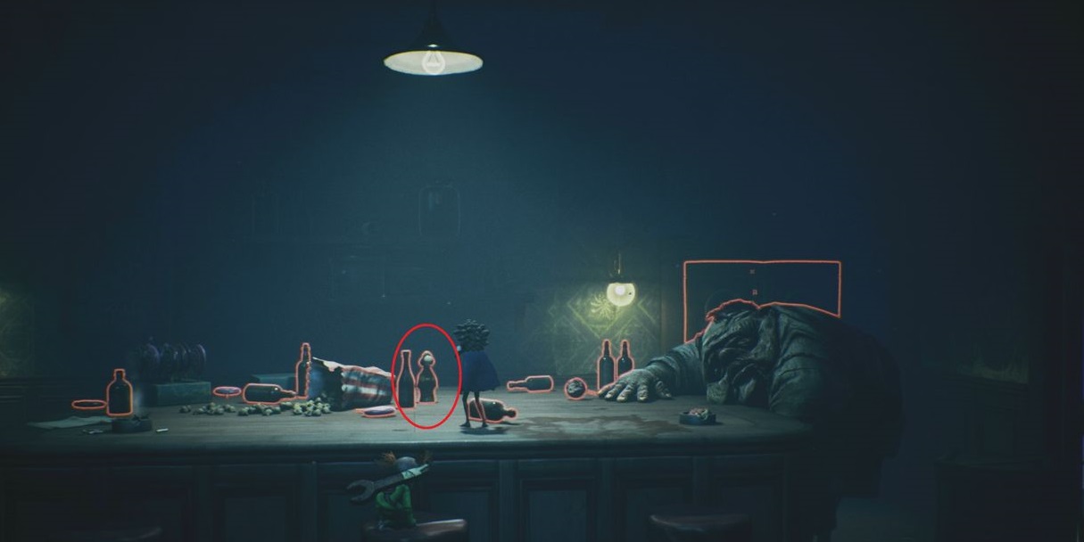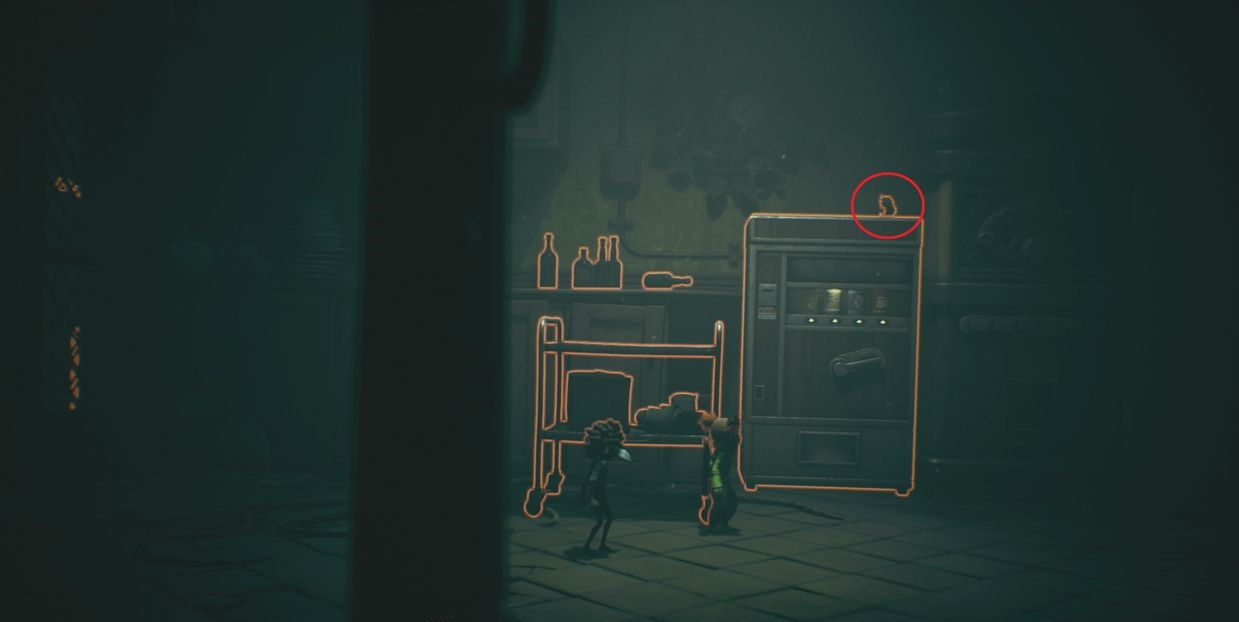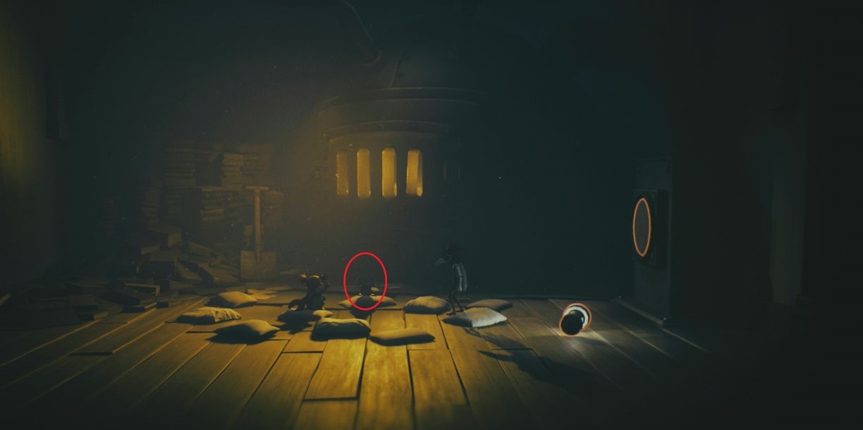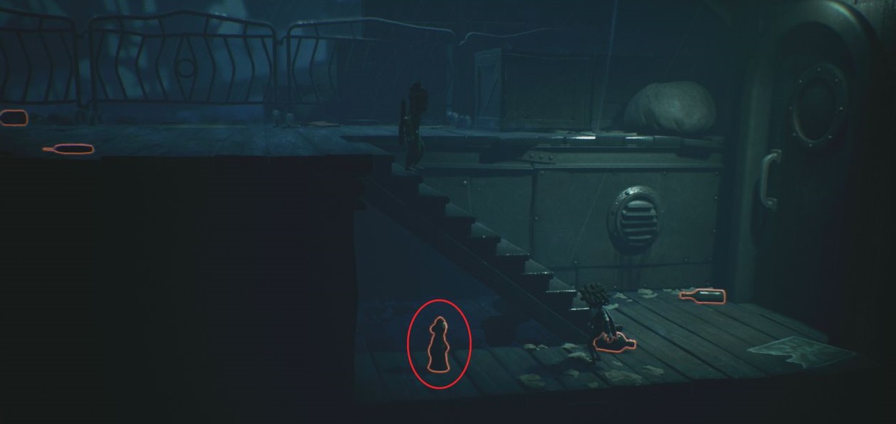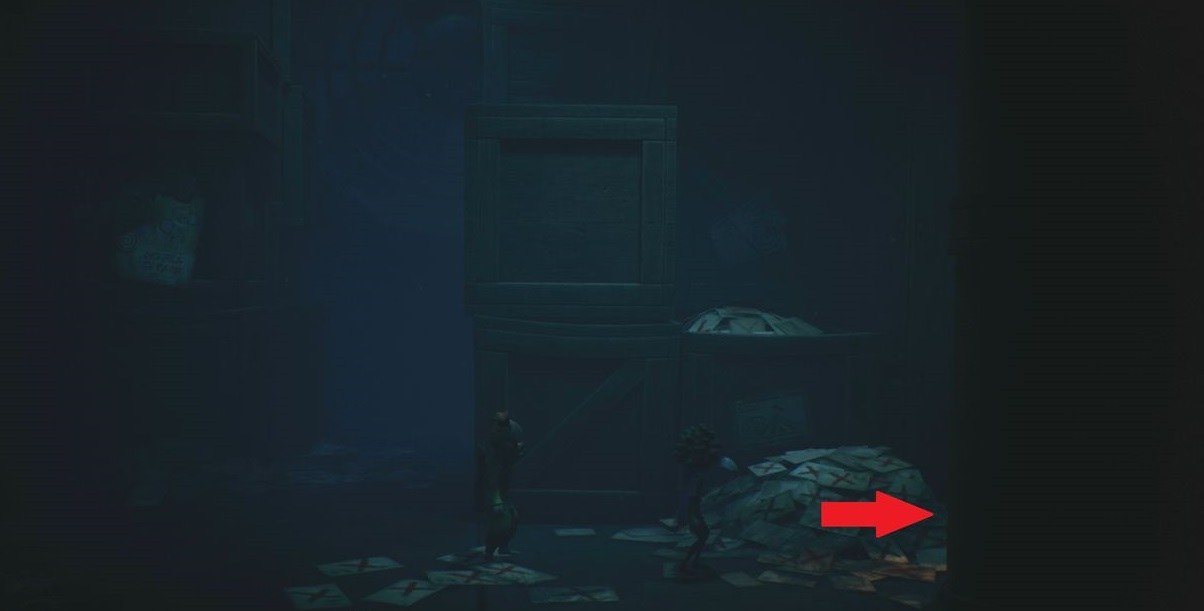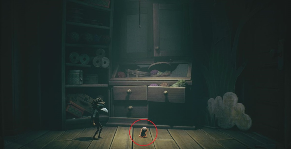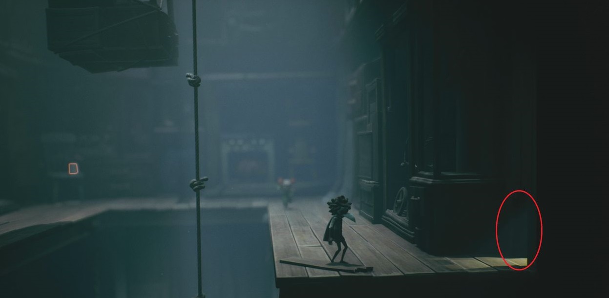 После того как подниметесь по большой полке с бутылками и цепью, идите в правую сторону и пройдите через отверстие в стене — за ним будет кукла. Также вы можете вытащить ящик с полки в этой комнате, чтобы напугать Нома.