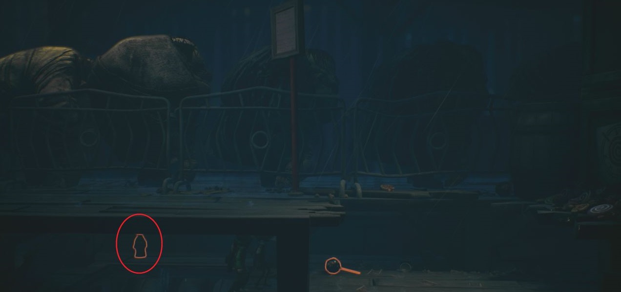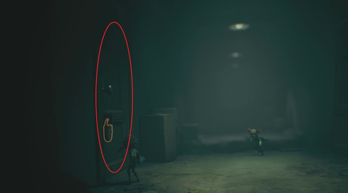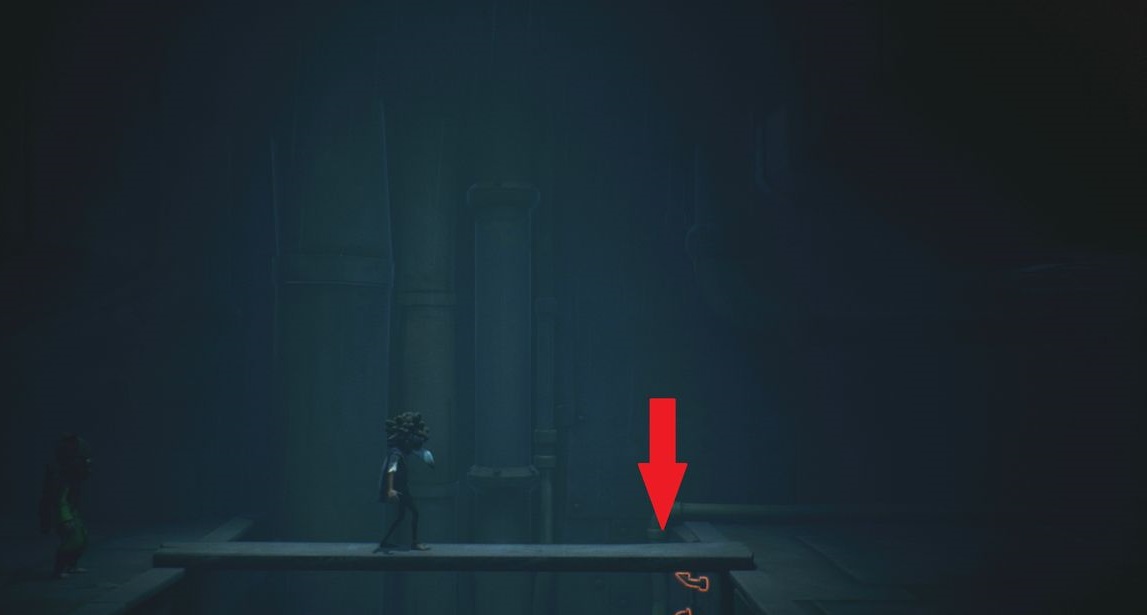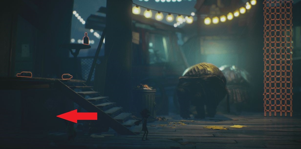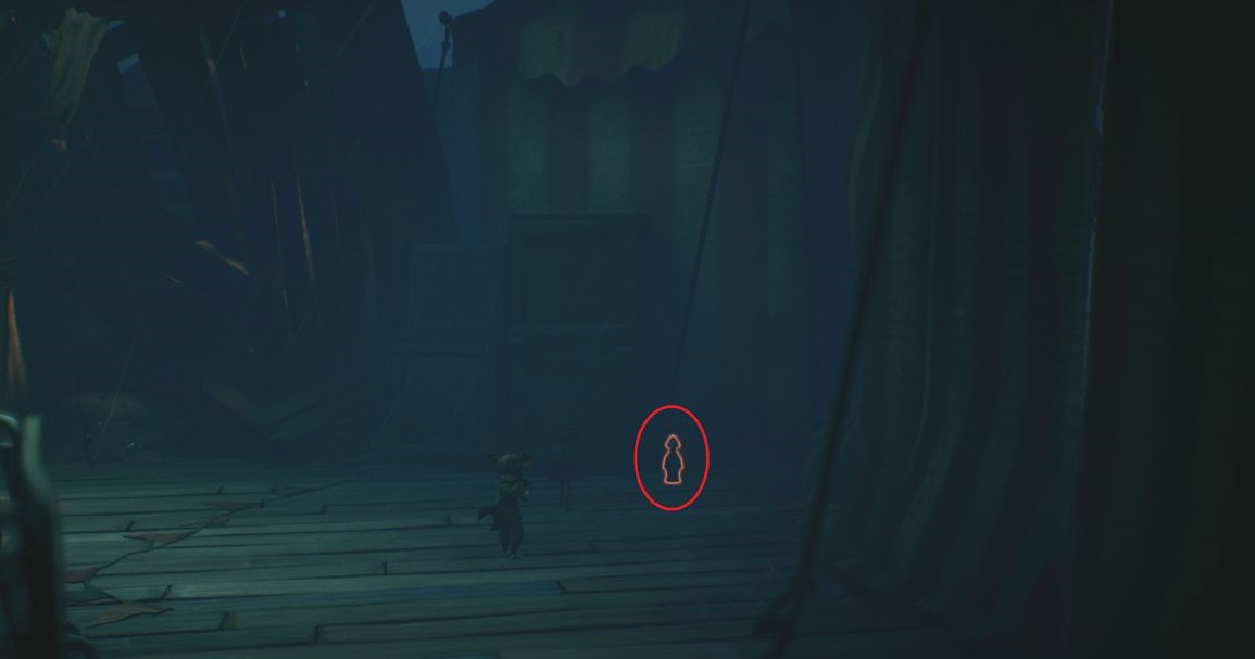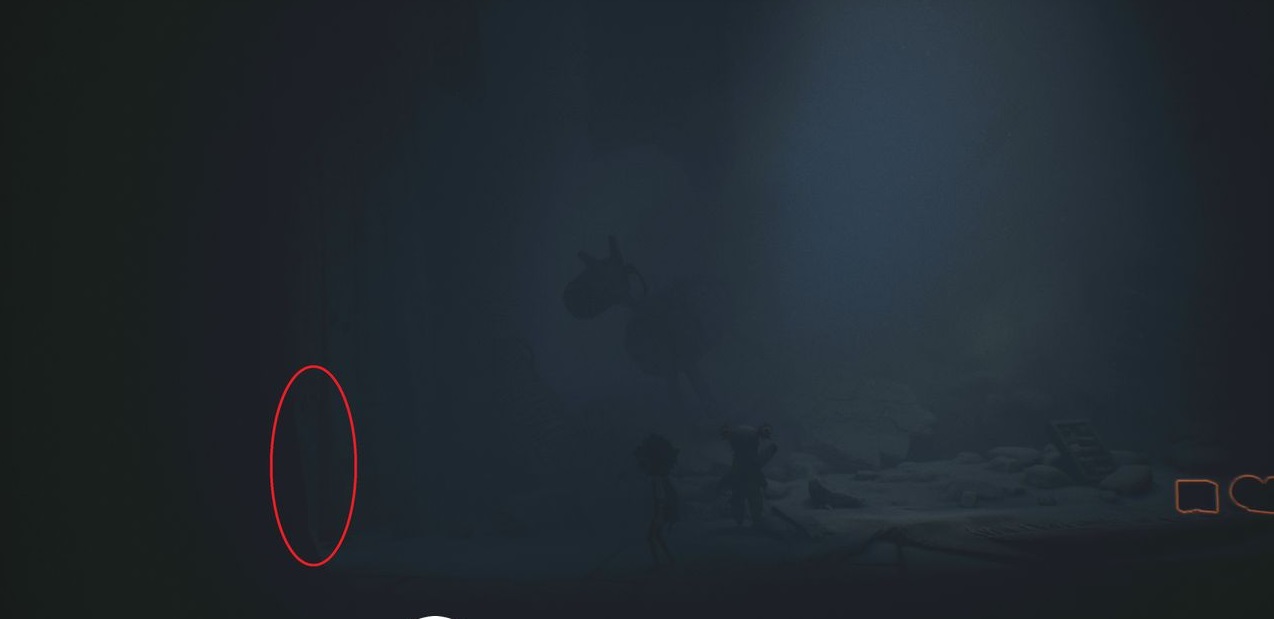 После того как подниметесь по большой полке с бутылками и цепью, идите в правую сторону и пройдите через отверстие в стене — за ним будет кукла. Также вы можете вытащить ящик с полки в этой комнате, чтобы напугать Нома.