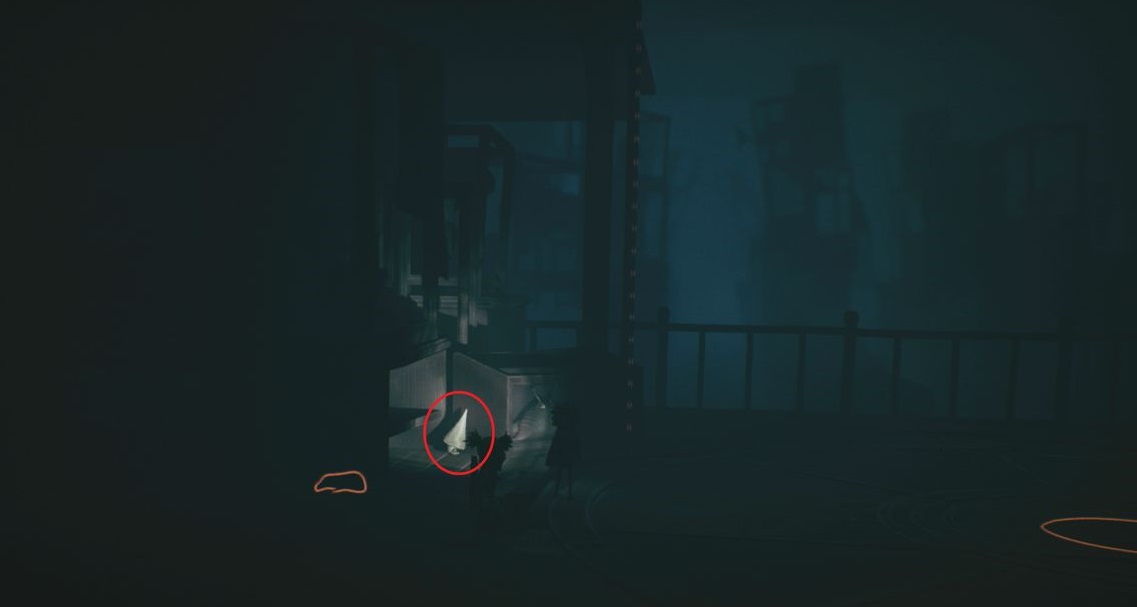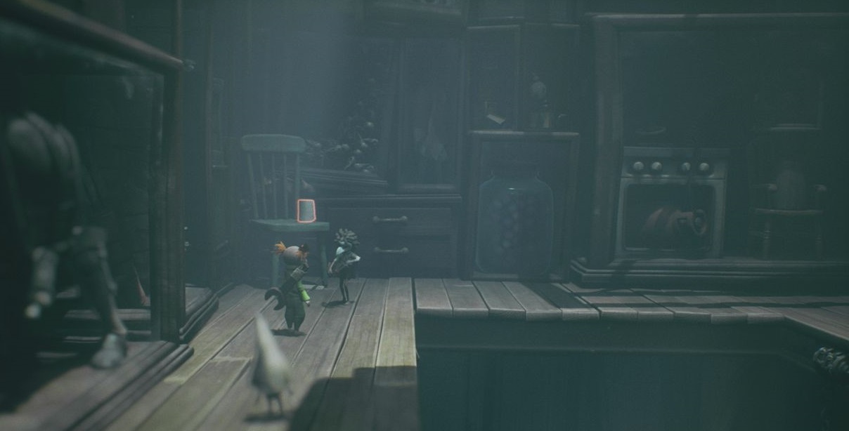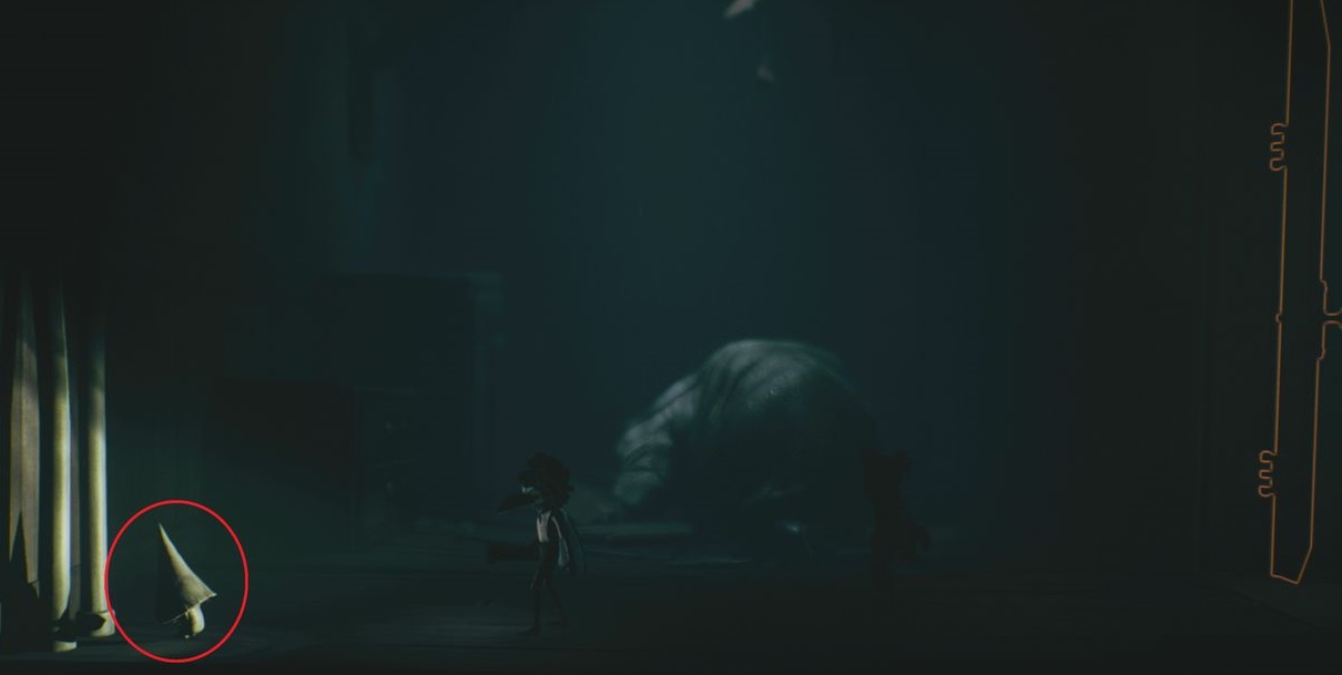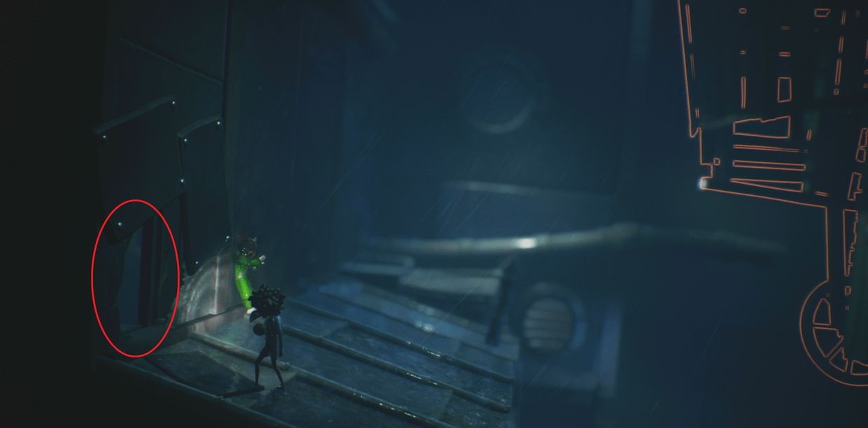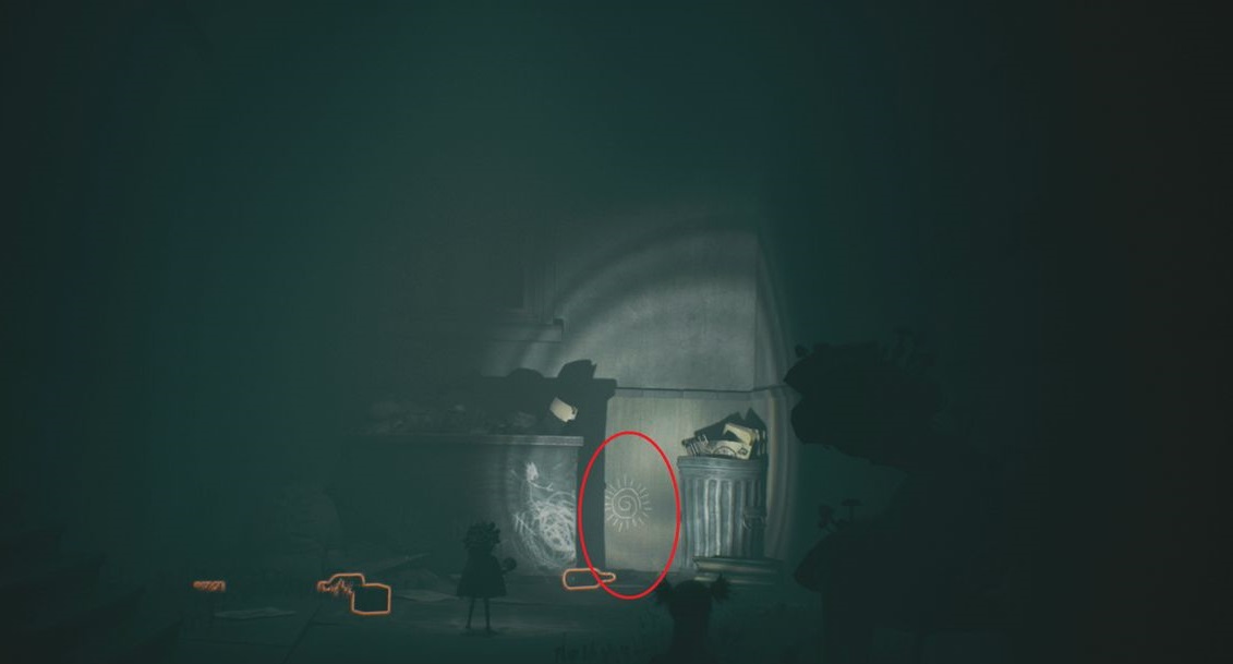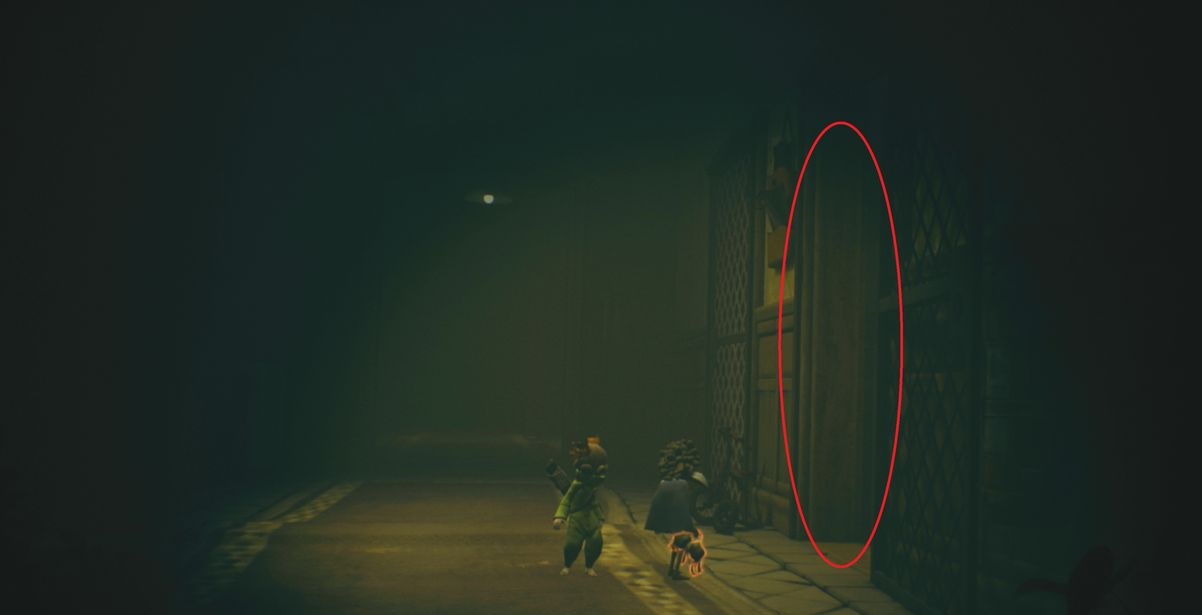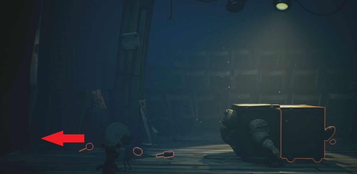 После того как подниметесь по большой полке с бутылками и цепью, идите в правую сторону и пройдите через отверстие в стене — за ним будет кукла. Также вы можете вытащить ящик с полки в этой комнате, чтобы напугать Нома.