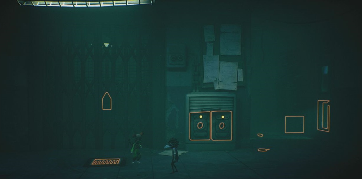 Продолжите движение в левую сторону, спуститесь вниз по тёмному коридору, пока не окажетесь в комнате. Выстрелите в кнопку, чтобы спугнуть Нома.