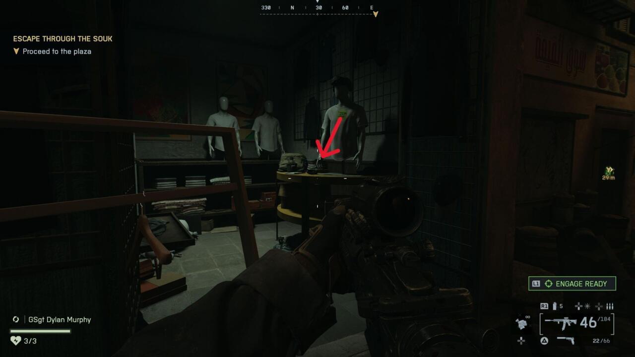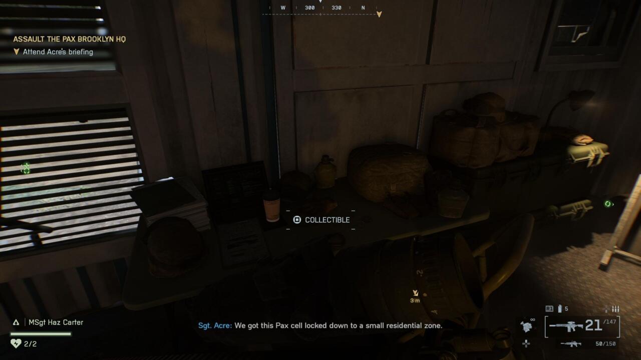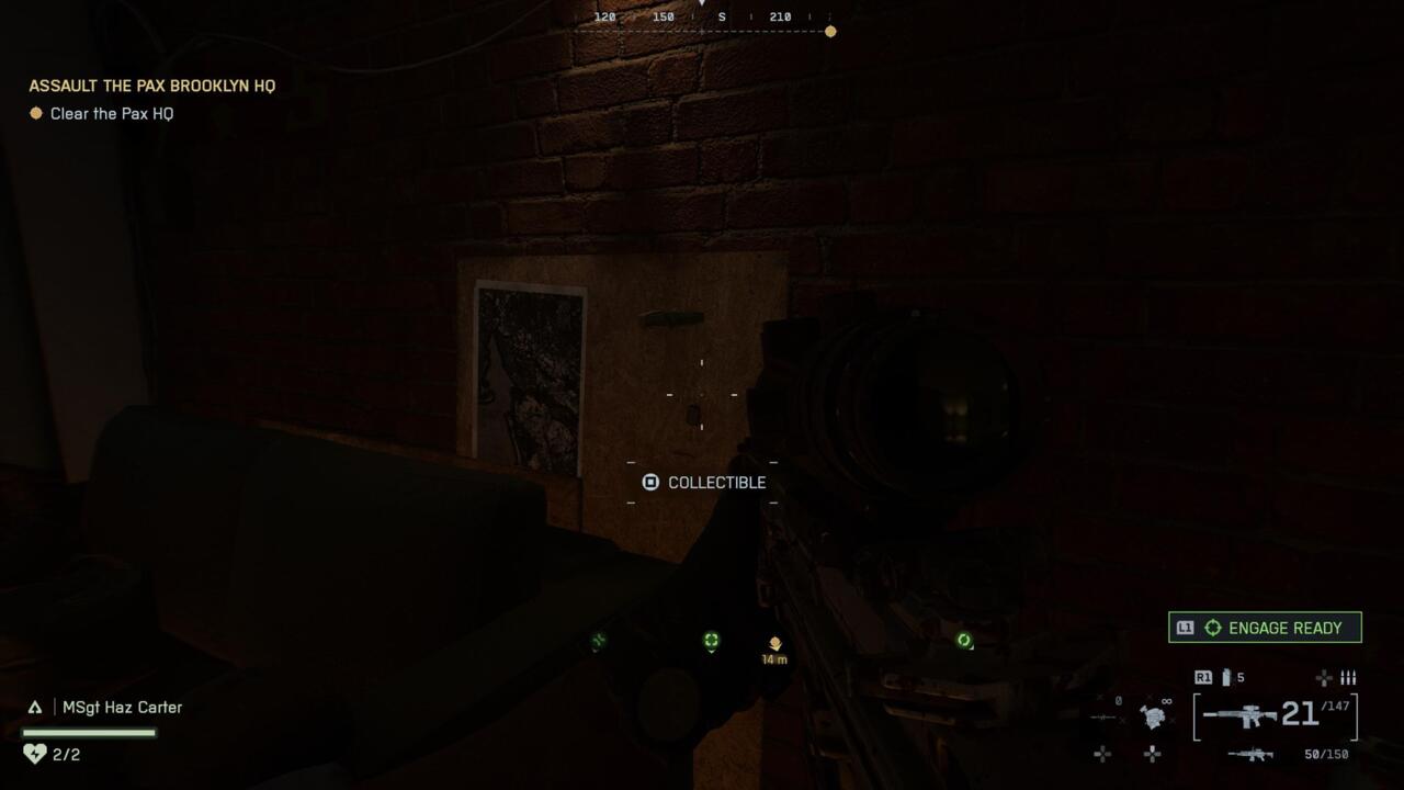 Последний жетон этой миссии можно найти в комнате с РПГ, когда вам прикажут сбить вертолет. Он висит на ноже, воткнутом в плакат Pax.