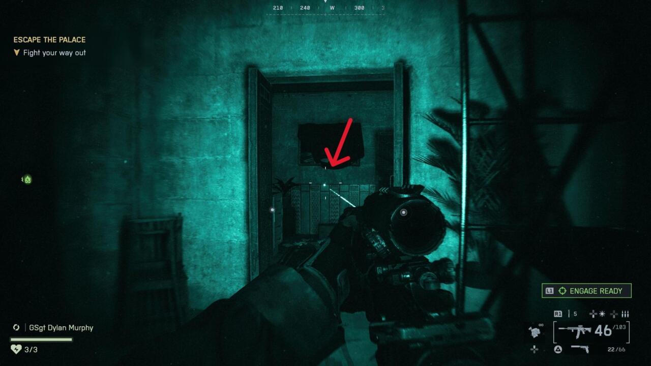 Первый жетон можно найти в дворце, после того как отключите питание. Поднимитесь наверх — в одной из малых комнат ищите жетон, который приколот к накрытому покрывалом зеркалу (или картине). Его можно взять до или после выполнения цели «Взорвать дверь» — если пропустите, сможете подобрать во время побега.