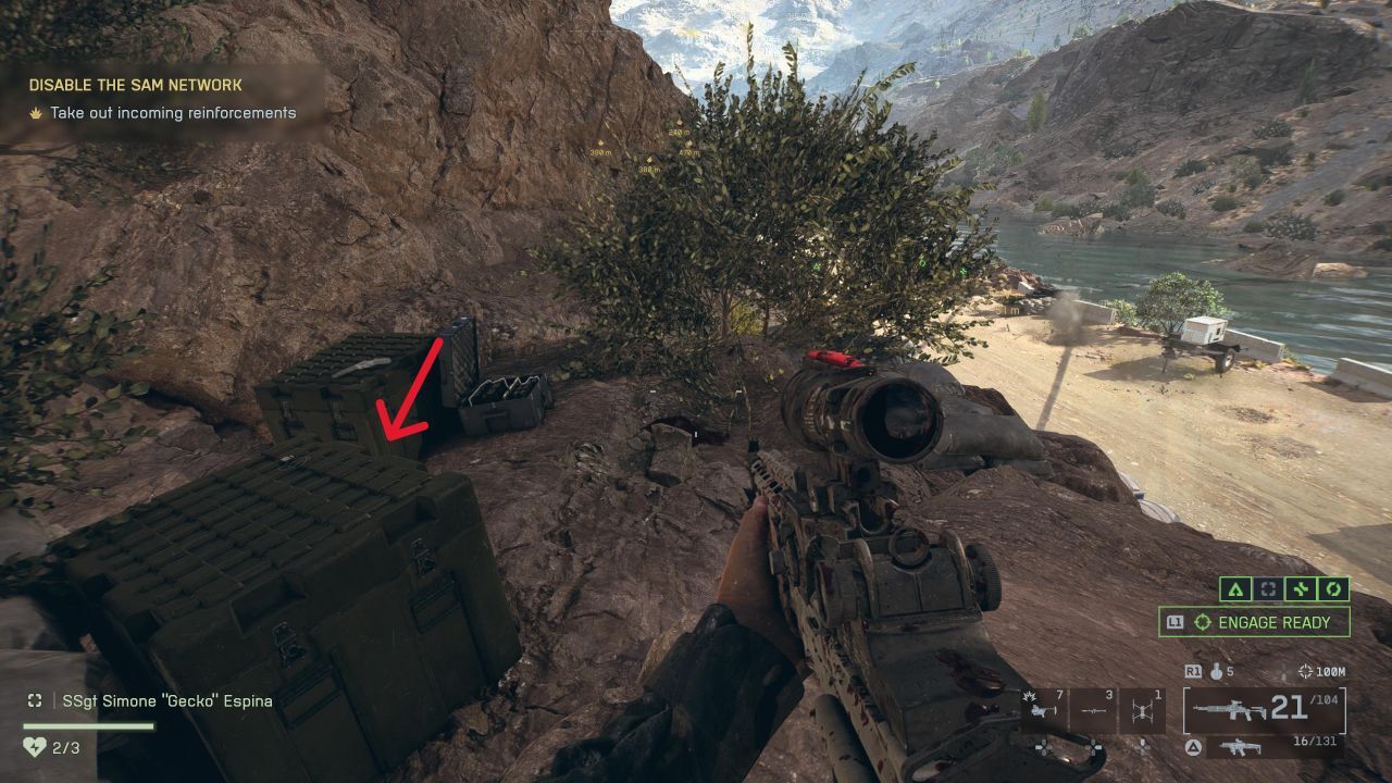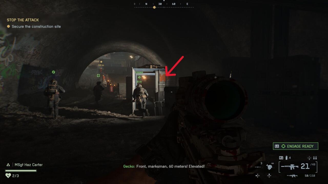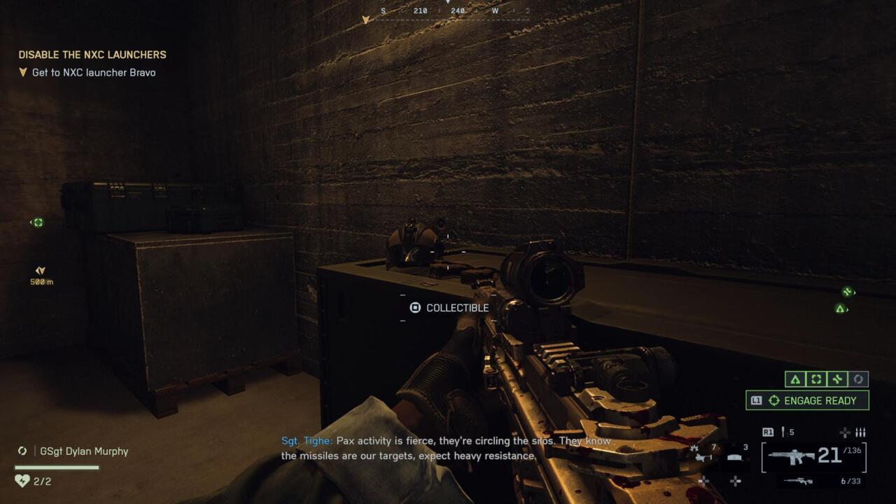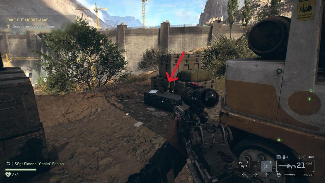 Последний жетон второй миссии можно найти после выхода из туннелей, когда вы должны будете помочь с зенитным орудием. Спуститесь по лестнице в указанную область — жетон висит внутри полного снаряжения грузового контейнера.