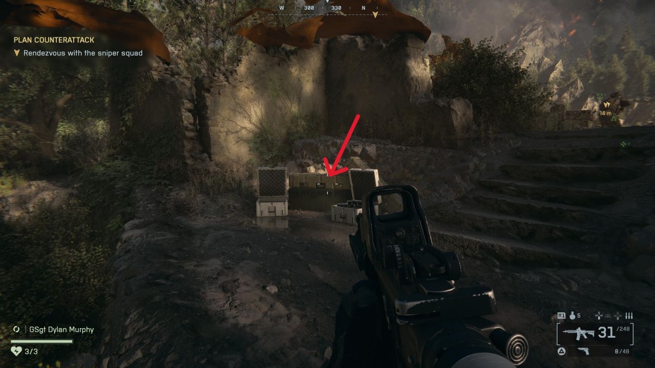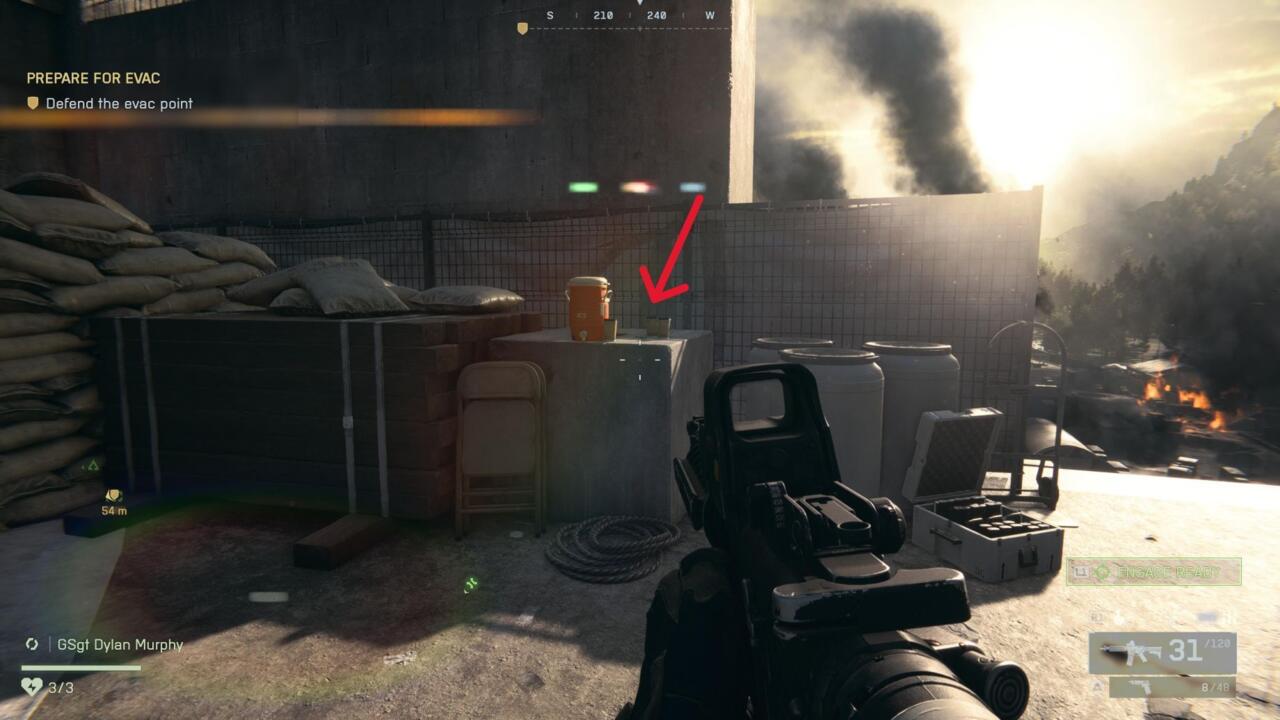 Первый жетон можно найти после того, как вы покинете танк и направитесь к точке встречи со снайперами. Когда начнете подниматься к ним, посмотрите в левую сторону — жетон лежит на ящике рядом с пунктом пополнения боеприпасов.