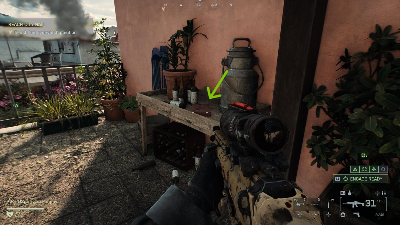 После того как зачистите первую зону с противниками, вам поручат сопроводить движущийся вверх по холму танк. Он направляется к мэрии. Слева от танка, на ящике с предметами лежит очередной жетон. Не подходите слишком близко к танку — иначе он поедет дальше, и жетон станет недоступен.