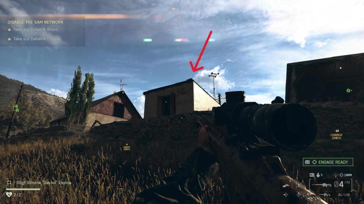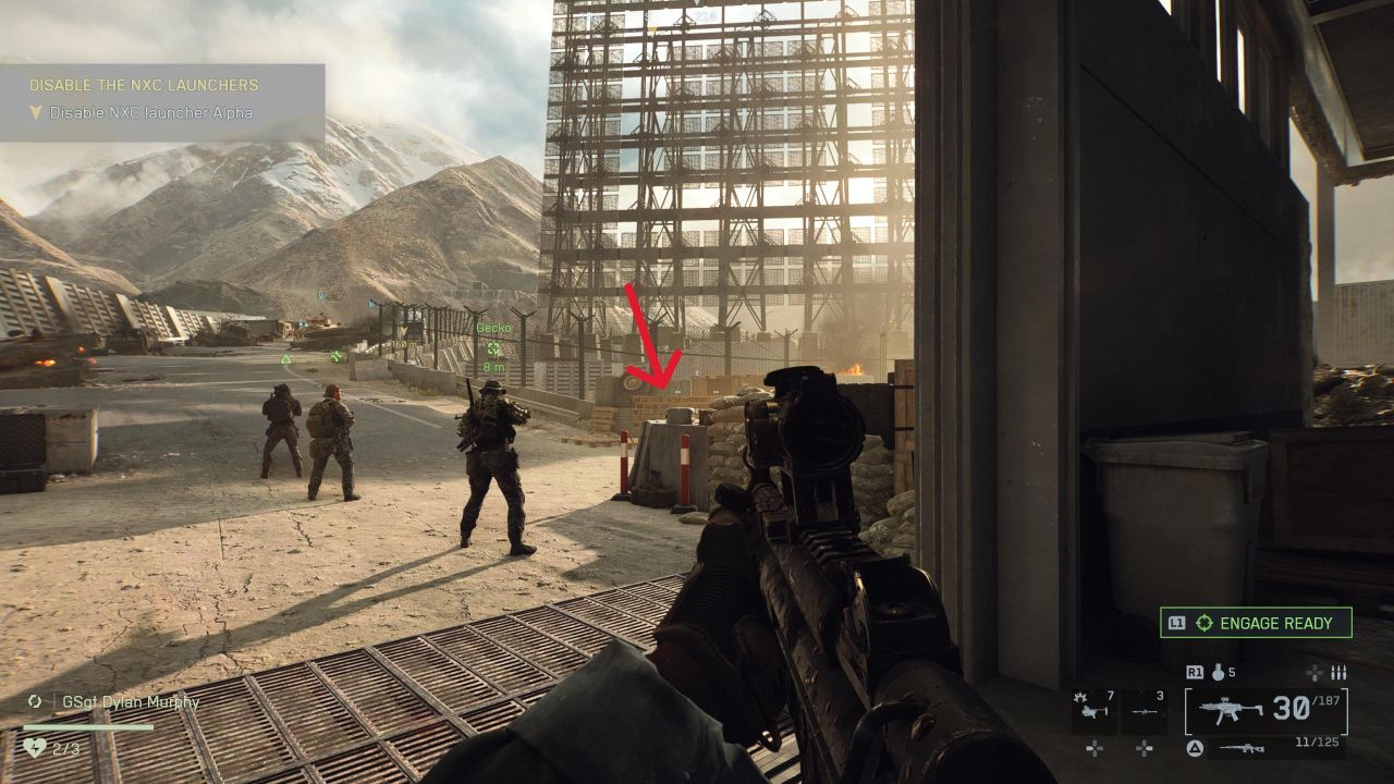 Когда получите задание отключить «Альфу», сможете найти жетон снаружи третьего здания, через которое пройдете перед тем, как присоединиться к стоящим на дороге войскам. Он находится с обратной стороны, справа, на выступе у мешков с песком и снаряжением.