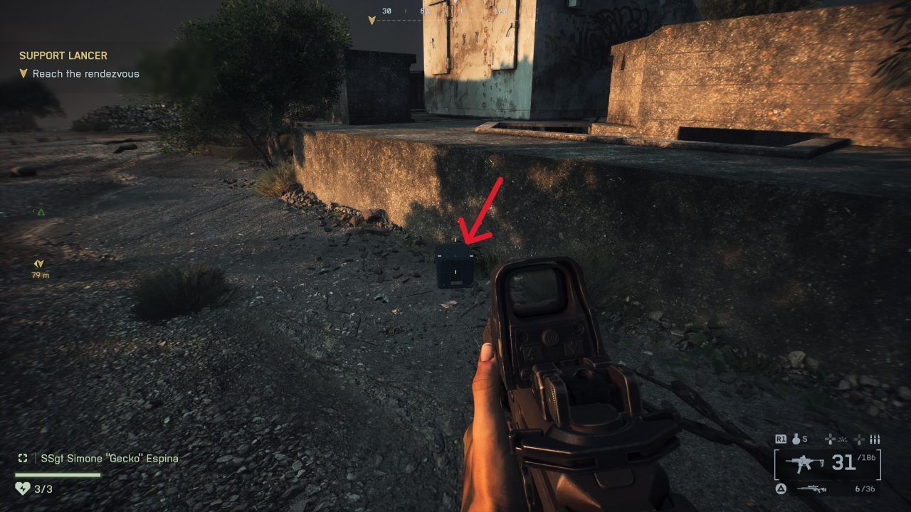 Третий жетон можно найти по пути к «Дельте», вскоре после того как проверите Лопеса. Находится он на возвышении, недалеко от места, где был снайпер. Не спешите выполнять приказ и идти к цели. Вместо этого поднимитесь на холм за синими биотуалетами — жетон лежит на ящике с припасами.