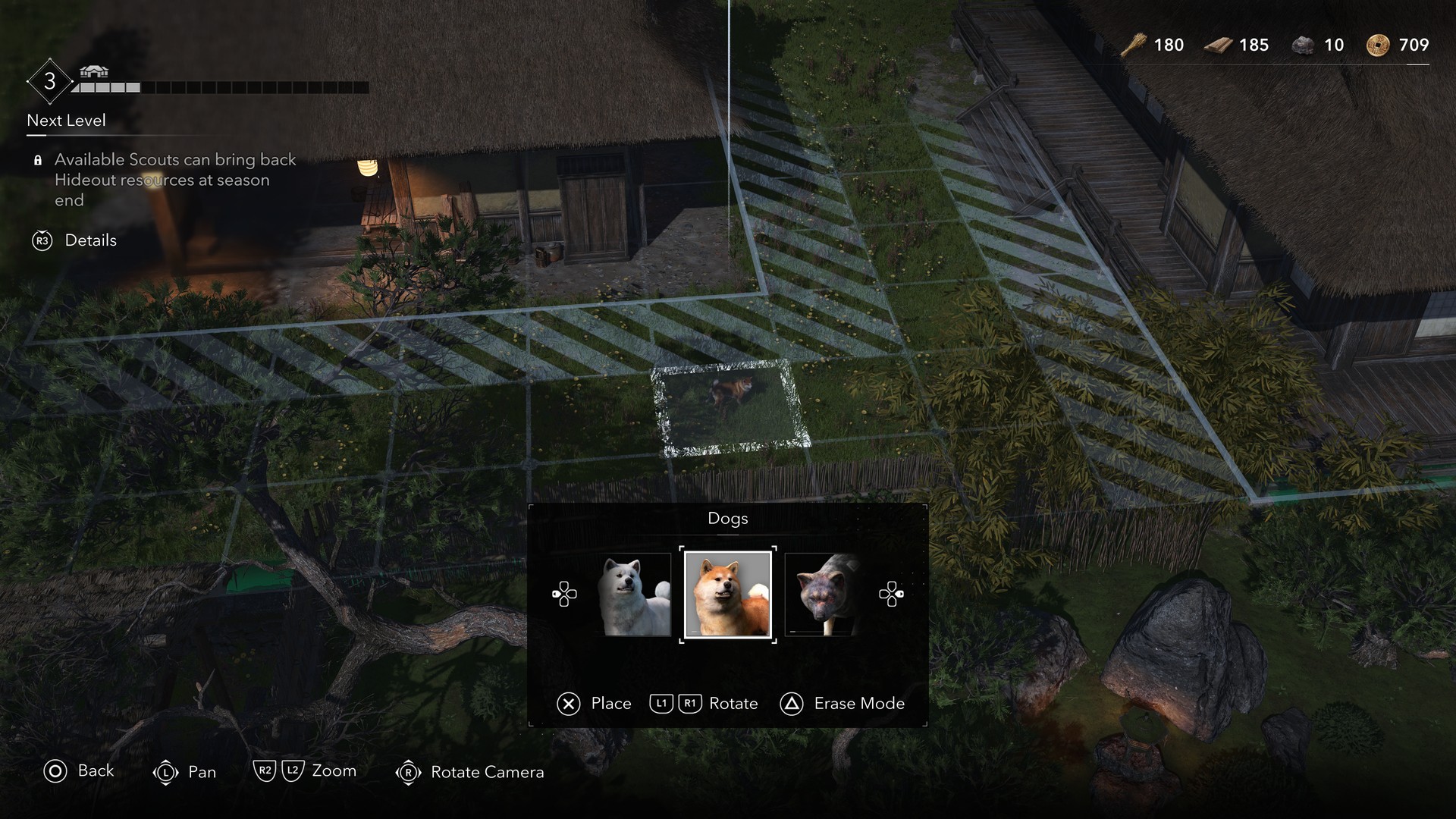Чтобы это сделать, переместитесь в Убежище, затем используйте появившуюся на экране подсказку «Улучшить убежище» или щелкните по модели мини-деревни внутри Хиромы, чтобы попасть в меню строительства зданий. В этом режиме выберите «Построить» («Пробел» на PC или лквадратик» на PS5) и перейдите на вкладку «Питомцы». Здесь вы увидите список всех питомцев, которых уже успели приобрести.