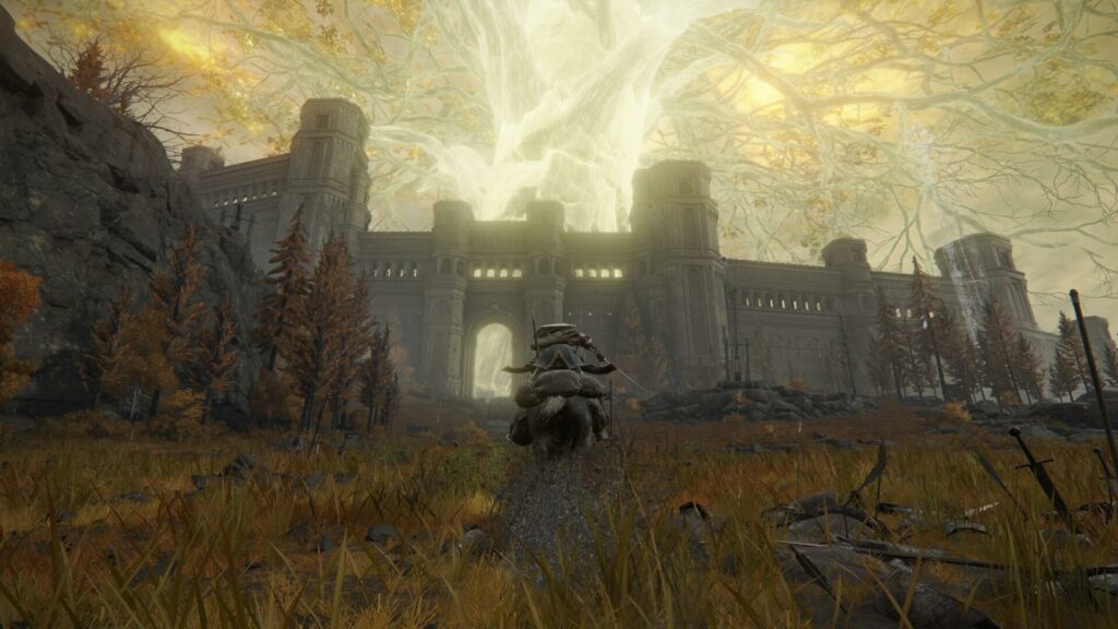Пройдите за врата и бегите к древу впереди. Активируйте место благодати «Внешняя стена призрачного дерева» и подберите два золотых семечка. Рядом также находится путеводная стела. Заберите карту «Лейнделл, столица королевства». Поднимитесь вверх по холму на юго-восток, в храм малого древа Эрд. Войдите внутрь и подберите справочник проповедника. Активируйте одноименное место благодати, подберите печать Золотого порядка (магическое дальнобойное оружие) и несколько золотых многоножек (материал для создания предметов). Если смотреть на тот же храм со стороны золотого древа, справа от него есть лагерь. Идите туда и убейте всех врагов, в том числе одного большого монстра, из которого выпадет еще одно золотое семечко. Внутри повозки находится сундук с большим молотом «Гроза великана».