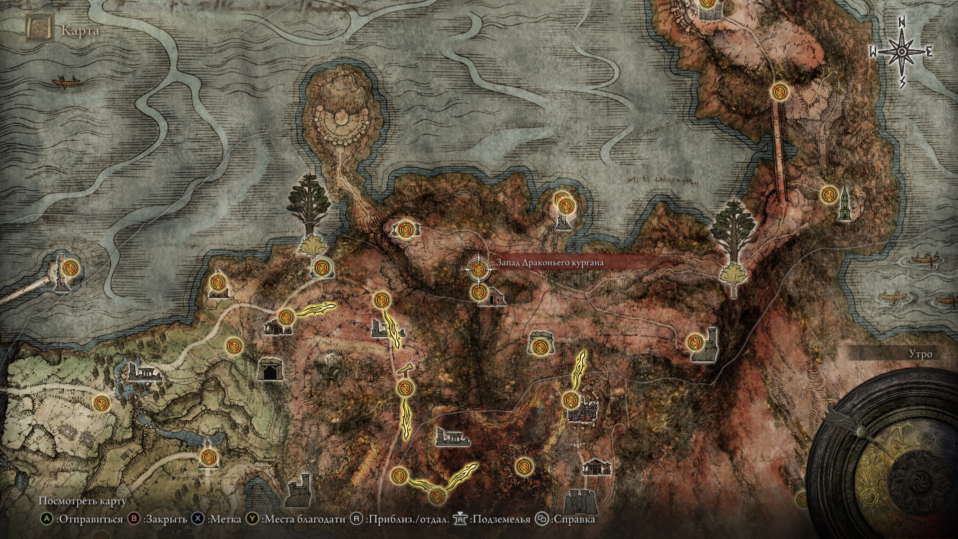 Вернитесь к Руинам Калема, двигайтесь на восток, при этом поставьте маркер на путеводной стеле. На Потоке перепрыгните через пропасть, чтобы оказаться в новом месте. Это Драконий курган Грейолла. Сразу же активируйте место благодати «Запад Драконьего кургана». Бегите к путеводной стеле и заберите карту. Чуть дальше есть небольшое озеро с двумя драконами. Убив их, вы сможете подобрать маленький камешек, руну жителя окраин (4) и ломтик мяса. Около башни на севере (смотрите на карту) есть скарабей. Он взрывается при уничтожении, но из него выпадает кузнечный камень мрака (8). Спрыгните на левую ветку у башни и пройдите к ней. Двигайтесь вверх по деревянной лестнице, сверните вправо и доберитесь до другой лестницы. Пройдите еще правее, не поднимаясь по ней, чтобы обнаружить фиолетовый предмет. Это мечевидный ключ. Подобрав его, вернитесь назад и поднимитесь по лестнице. Используйте поток и перемещайтесь вокруг башни по часовой стрелки, перепрыгивая обрывы. Найдите третью лестницу и полезайте вверх. Пройдите влево и активируйте место благодати «Священная башня Звездной Пустоши». Бегите вверх по ступеням и откройте дверь. Езжайте вверх на лифте, поднимитесь выше и восстановите силу Великой руны Радана. Она увеличивает выносливость, здоровье и концентрацию.