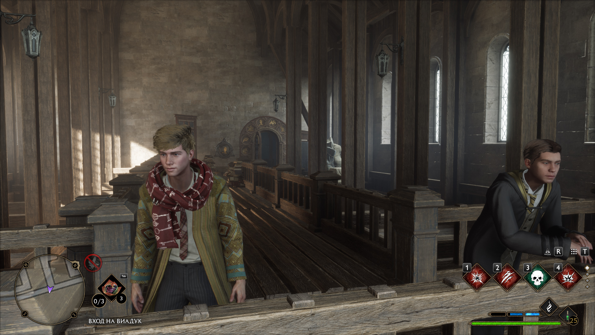 - Центральный зал. Здесь можно найти сразу три страницы. Первая находится у выхода во двор трансфигурации. Когда окажетесь перед дверью, ведущей наружу, увидите летающую рядом с ней страницу. Используйте Accio, чтобы притянуть ее к себе. Следующая страница расположена рядом с тем же местом. Обернитесь так, чтобы дверь во двор трансфигурации оказалась за вашей спиной. Посмотрите вверх и увидите эту страницу. Последняя страница в центральном зале расположена возле дверного проема, ведущего в большой зал. Она летает рядом со знаменами, по очень длинной траектории, поэтому, если не заметите ее сразу, немного подождите, и она прилетит в это место. Вы также можете использовать Ревелио, чтобы разглядеть страницу, которая будет выделена синим цветом.