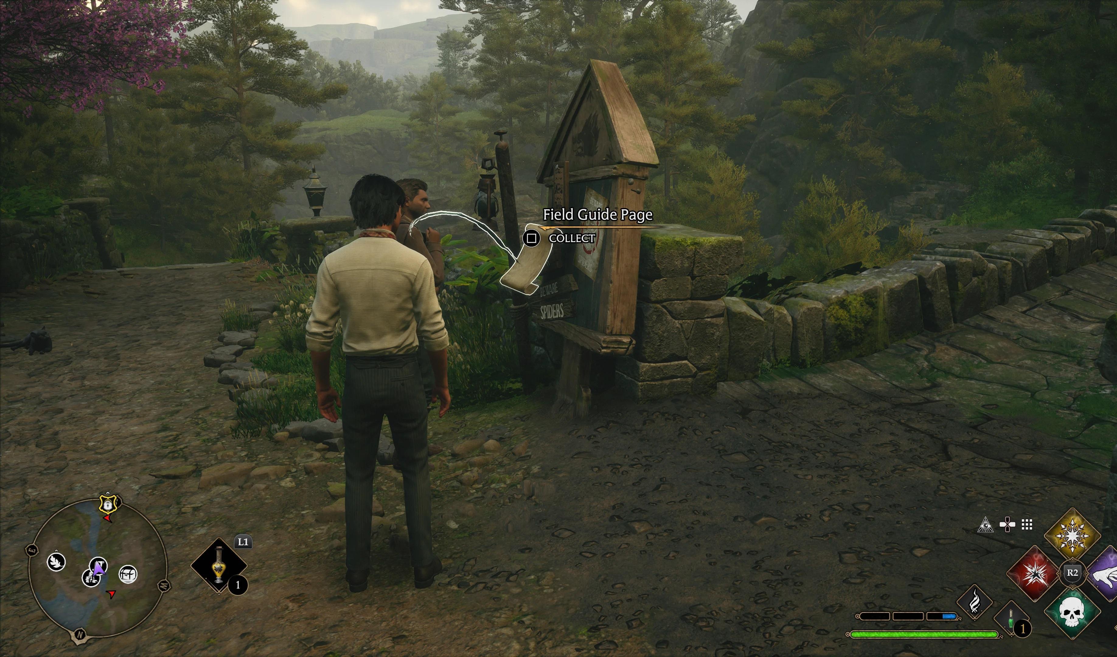 - К западу от летучего пламени «Западный Хогсмид». Вернитесь через мост, двигаясь к летучему пламени Западного Хогсмида. Когда пройдете мост, обнаружите в этом районе еще одну летающую страницу.