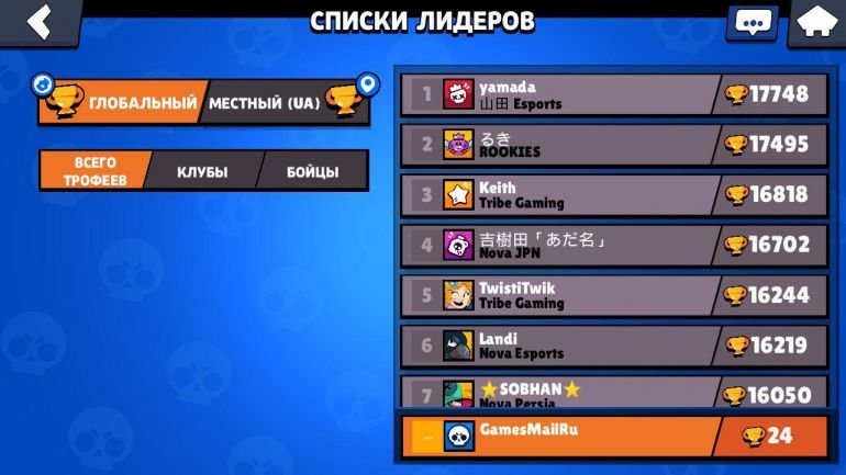 Также в Brawl Stars есть таблица лидеров. Каждый боец участвует в индивидуальном рейтинге, при этом игроки могут ранжироваться по континентам или странам. Существует одна общая таблица лидеров, основанная на общем количестве трофеев. А также одна таблица с рейтингом банд.