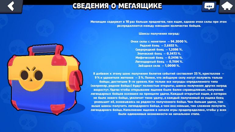 Щелкните по иконке ящика в магазине, нажмите на «белый восклицательный знак» и увидите шанс выпадения каждого предмета.