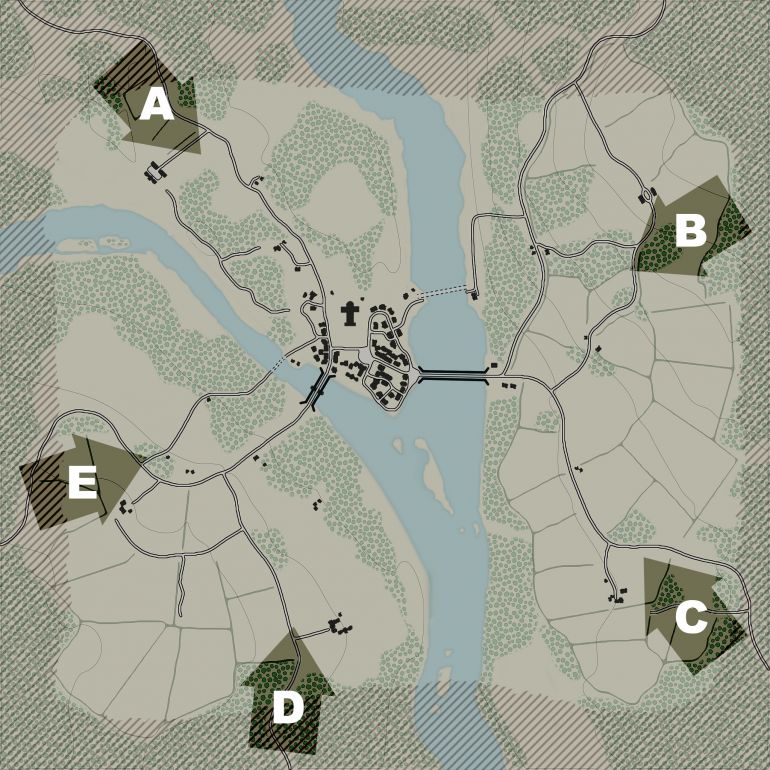 Одна лачуга расположена в лесу рядом с небольшой дорогой, ведущей к реке с возможностью добраться до E3 на транспорте. Внутри вы должны без проблем захватить цель, если только кто-то не бросит гранату внутрь или парашютист приземлится на крыше. Также остерегайтесь возможных врагов, скрывающихся в лесу неподалеку. Лес здесь — идеальное место для маскировки и отличного место для засады. Также помните, что линия — совсем рядом, и вас могут атаковать с фланга. Не двигайтесь прямо вперед, не проверив, что происходит по сторонам. До точки E4 можно добраться при помощи скрытого перехода через реку. Вы также можете использовать мост, но это не рекомендуется, так как защитники будут вас ждать.