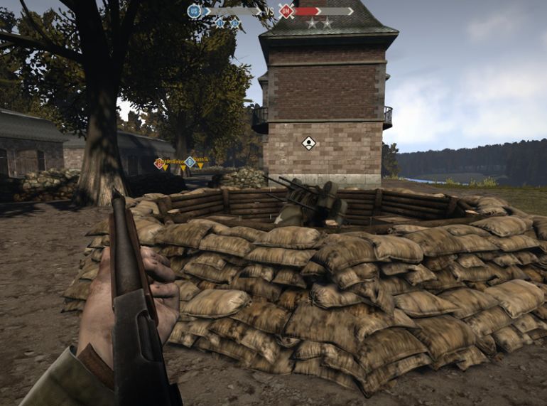 Итак, C4. Одно высокое здание, окруженное другими зданиями, и главная дорога к центру города. Здесь три входа, один спереди, один сбоку и последний вход сзади. В главной комнате есть стеллажи и небольшой угловой коридор. Две лестницы ведут на первый этаж, где расположено радио. Выше чердак, где есть два открытых окна. Как и в случае с B4, эту точку трудно захватить, но это можно сделать с помощью парашютистов или неожиданных атак с разных направлений. Справа от главного здания, кроме деревянного забора, расположен один ящик с Panzerfaust 60. Также есть два зенитных орудия и бункер. После захвата этой цели атакующие разблокируют одну из главных точек захвата — полицейский участок (O1). С C4 вы можете использовать небольшие участки между домами, чтобы добраться до полицейского участка. Или можно просто ехать по дорога на чем-то быстром.