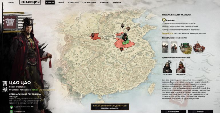 Если вы хотите оказаться в эпицентре королевской битвы, то Цао Цао — лучший вариант. Однако его кампания невероятна увлекательна, поскольку действие практически никогда не прекращается. В конце концов, его называют «Героем хаоса», а это значит, что он любит быть в центре конфликта. Если вы ищите более дружелюбную и простую сюжетную кампанию, то новичкам я бы порекомендовал Ма Тэнга или Сунь Цзяня.