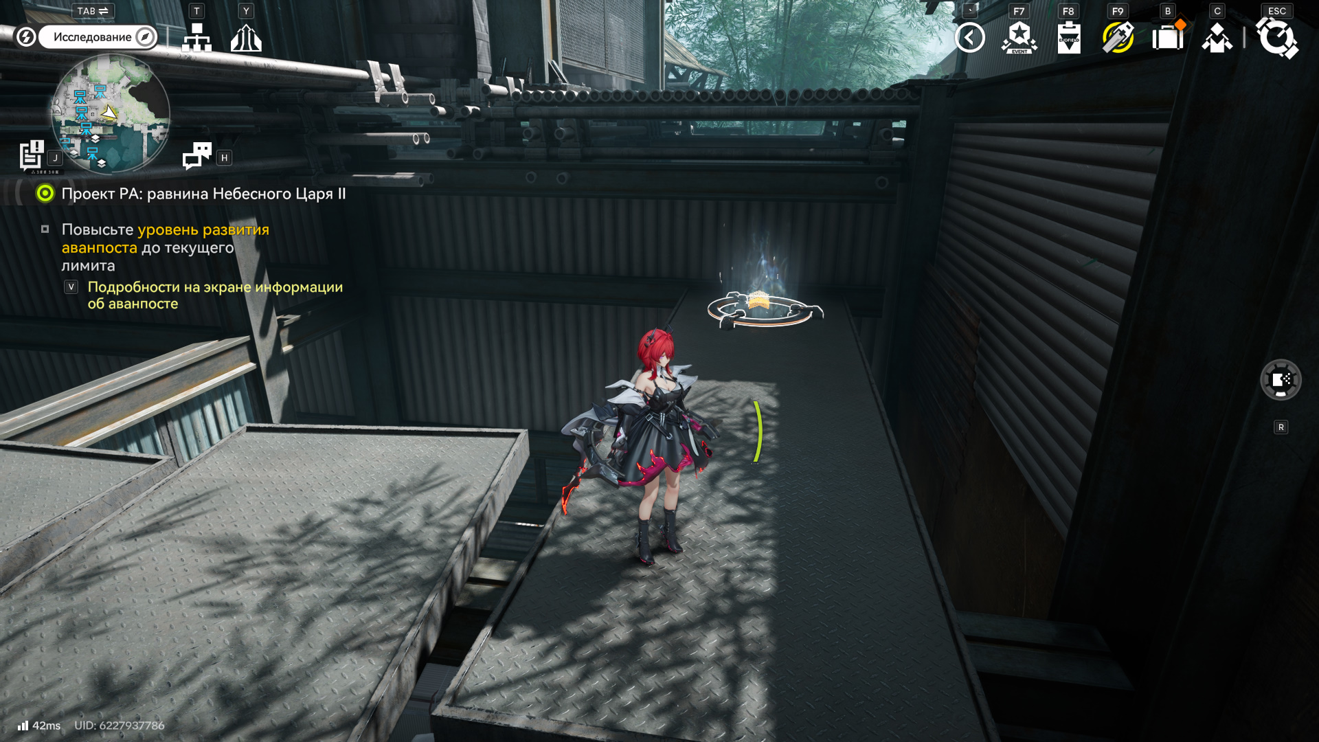 Телепортируйтесь к точке телепротокола справа и ниже Главного Форта, пройдите через мост на север, победите врагов и сверните в здание слева. С левой стороны в комнате есть ящик шаблонов снаряжения. Там же есть лифт. Поднимитесь на нем с помощью воды и спрея.