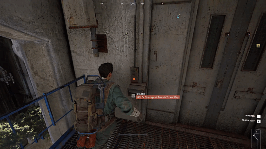 Получив ключ, отправляйтесь к Северной траншейной вышке. Добравшись до верхнего уровня, найдите синюю лестницу слева — она ведет к запертой двери. Эта дверь и открывается ключом от траншейной вышки.
