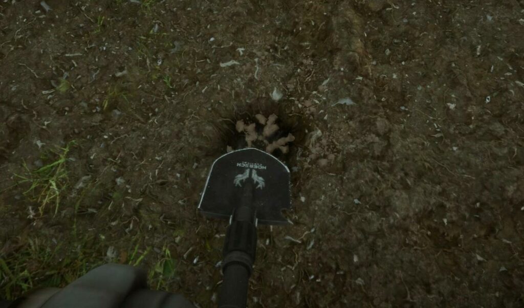 Лопата расположена на южной стороне горы, в пещере у ее основания. У входа в пещеру есть три человека, которых насадили на колья. Чтобы пробраться вглубь пещеры, понадобится тросомет, о котором мы рассказали ранее. Сделав это, вы столкнетесь с водоемом, для исследования которого требуется акваланг. Только при наличии акваланга вы сможете двигаться через туннели.