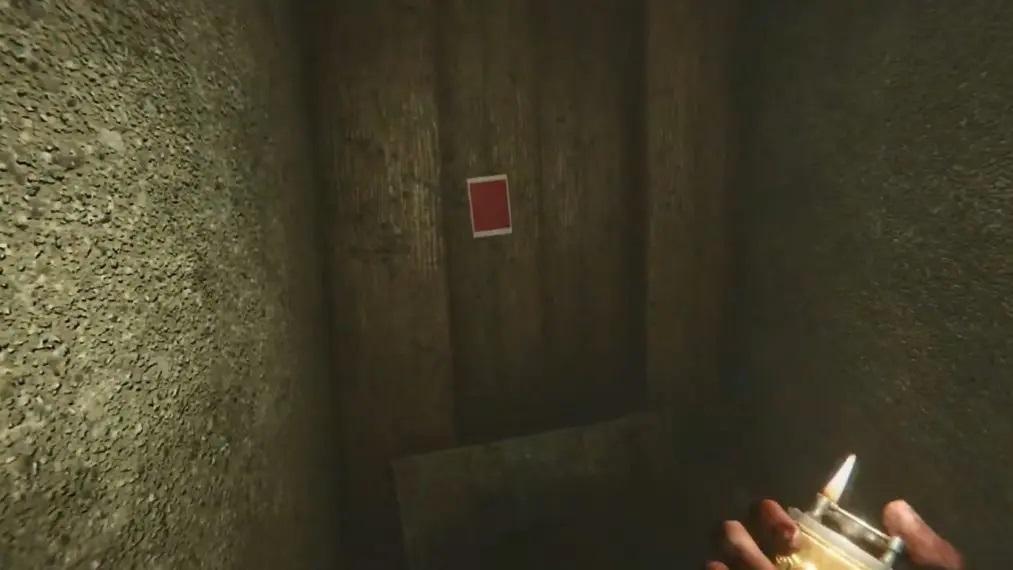 На этот раз нужно спуститься в подвал и использовать красный ключ. Фотография находится на коробке над вами.