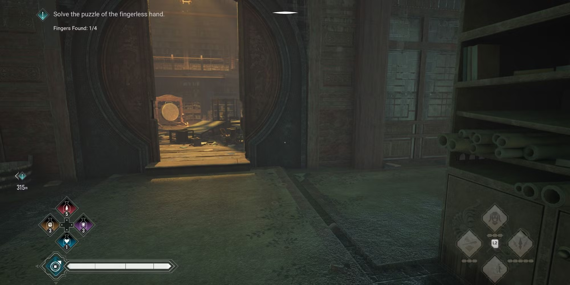 Первый палец находится в комнате слева от основного зала. Пройдите через круглую арку и войдите внутрь. В помещении увидите гонг и книжную полку слева.