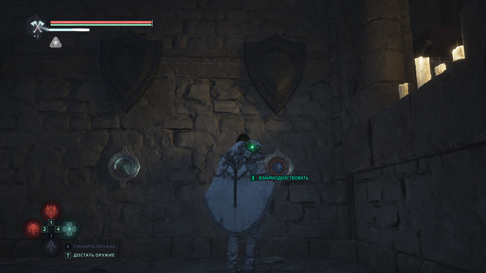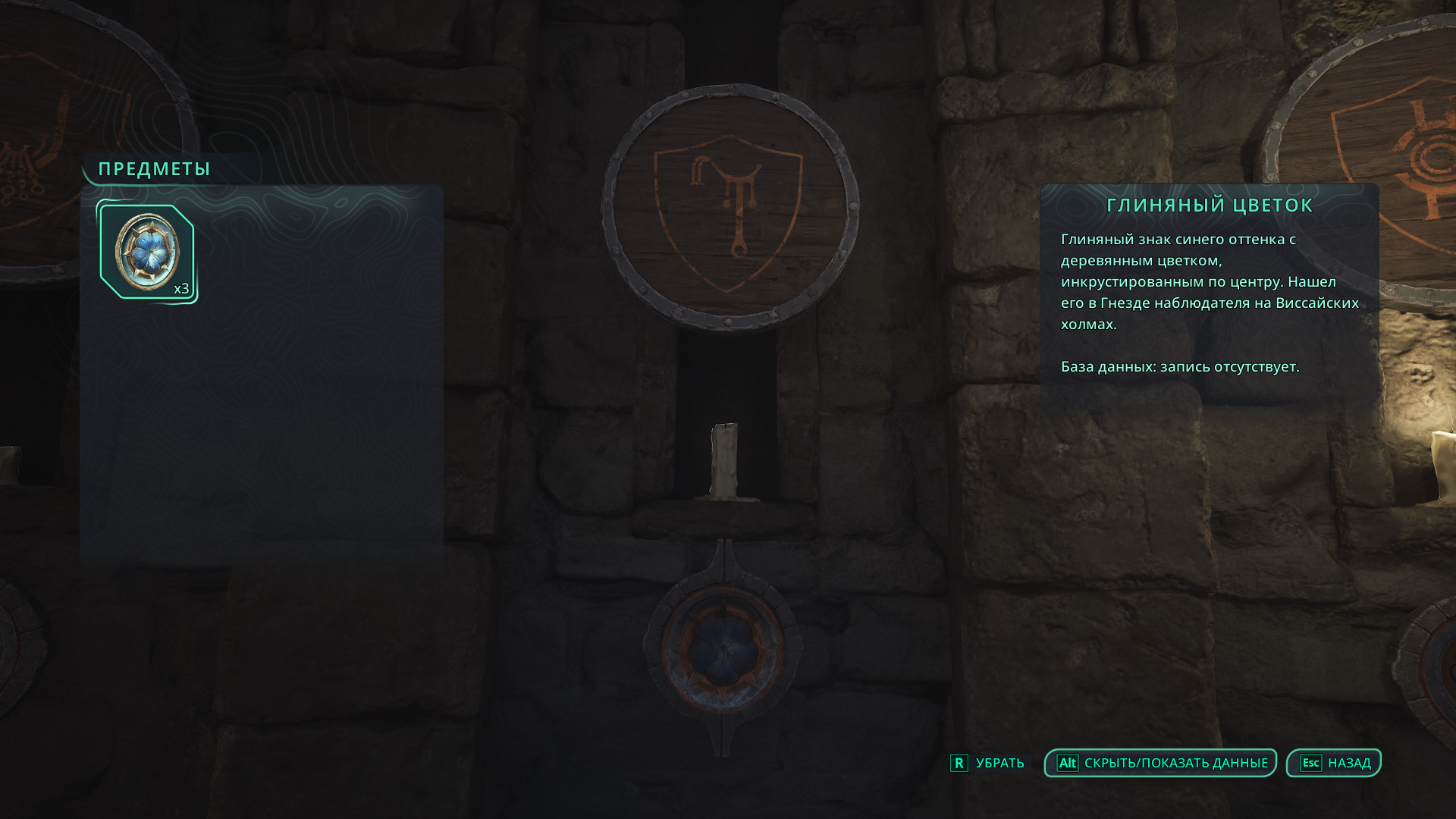 - Наконец, нужно определить эмблему, обозначающую имя. В еще одном письме рассказывается о выемках в нишах. Удалось перевести все четыре, указывающие на родовые имена. Родовое имя Пентоса — Альгея, что можно узнать с таблички на доспехах. Пройдите в нишу за доской в главном зале и вставьте глиняный цветок в отверстие слева, где висит табличка с именем Альгея.