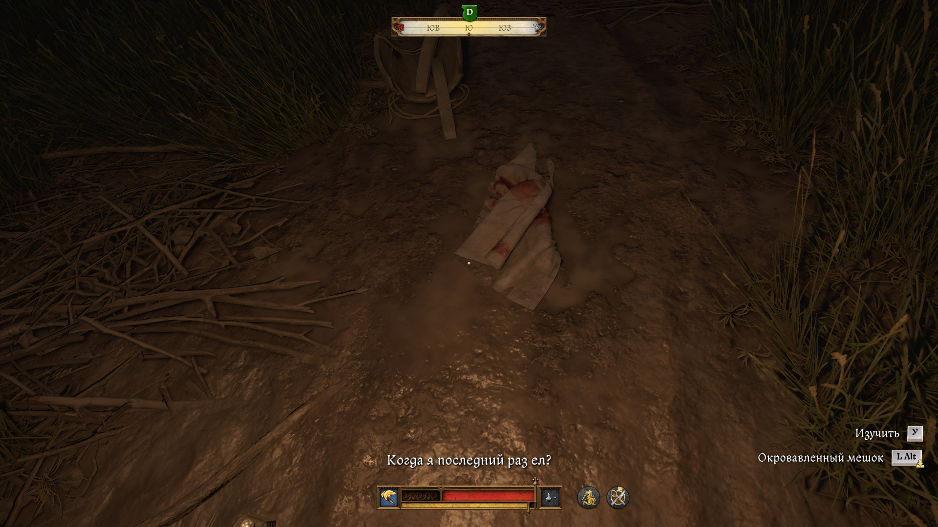 Попробуем его опередить! Езжайте в Биланы и двигайтесь к зоне поиска восточнее деревни. На левом из двух Т-образных перекрестков (ориентируясь по карте) ищите окровавленную ткань.