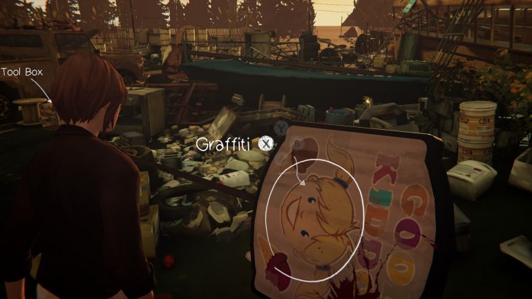 Чтобы нанести граффити на свалке, на сей раз предстоит соблюсти определенный порядок действий. Как только Хлоя войдет в своеобразный режим ярости, первым делом ломаем битой вывеску с мороженым, а после сшибаем ногой банку с краской. Таким образом, все будет готово для создания рисунка.
