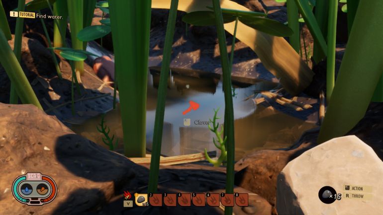 Задание активируется в тот момент, когда вы изучите устройство и отойдете от него. Вы узнаете о жажде. Самый быстрый способ найти источник воды — от устройства двигайтесь в сторону сигнала с помехами, сверните вправо с тропы и обнаружите грязную лужу. Попейте воды. Далее нужно будет отыскать чистую воду. А ее следует искать на высоких стеблях: большие свисающие капли. Обычно над лужами грязной воды.
