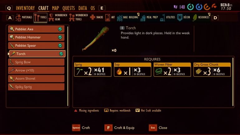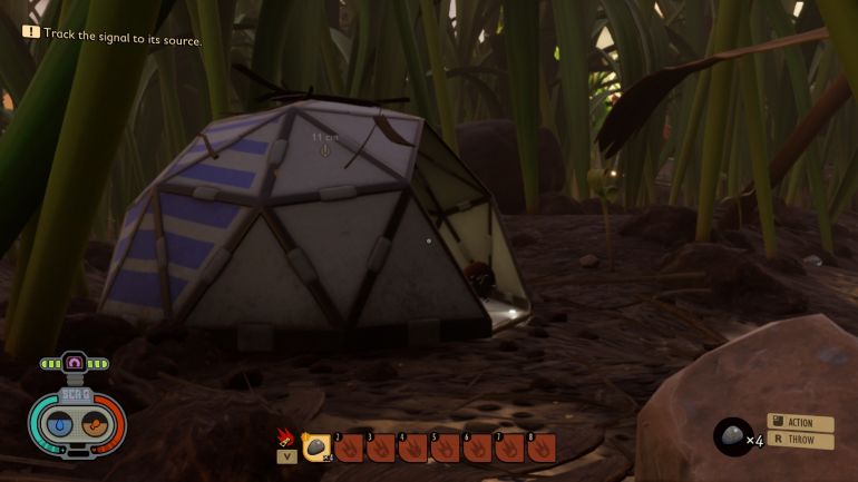 Для начала от таинственного устройства двигайтесь в направлении сигнала с помехами. По пути вы обнаружите сок растений (sup) — желтые капли на стеблях. Соберите его. Затем скрафтите топор. Прежде чем это получится сделать, в разделе материалов создайте волокнистый текстиль (Woven Fiber). Сделав топор, рубите стебли — зеленые и высохшие. Это принесет вам два совершенно разных ресурса. Сухие стебли нужны для создания факела. Сделайте факел и доберитесь до устройства с помехами. Вы увидите, что букашки блокируют его работу и грызут кабель. Убейте их и войдите в пещеру, взяв в руки факел. Разберитесь с остальными букашками.