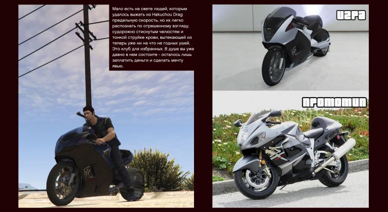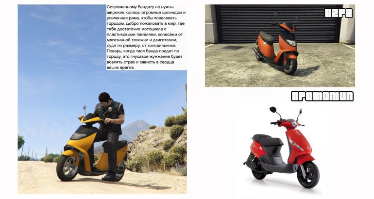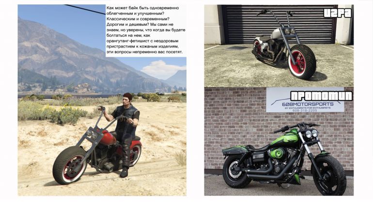 ПРИМЕЧАНИЕ: Это единственное новое транспортное средство, которое продается на внутриигровом сайте Legendary Motorsports. Все остальные мотоциклы из дополнения «Байкеры» можно найти в Интернет-магазине Southern San Andreas Super Autos.