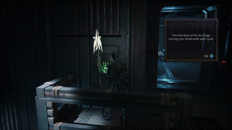 Для начала вам нужно добраться до Аркологии. После победы над Небесной Тварью (босс-химера) вы обнаружите разлом, терминал для паспорта Аркологии (для перехода в район Сон или Дорогу Икари) и еще один дверной проем. Если воспользуетесь этим проемом, то обнаружите лифт, который пока что находится в автономном режиме. Тем не менее, здесь есть подсказка, связанная с пятью глазами.