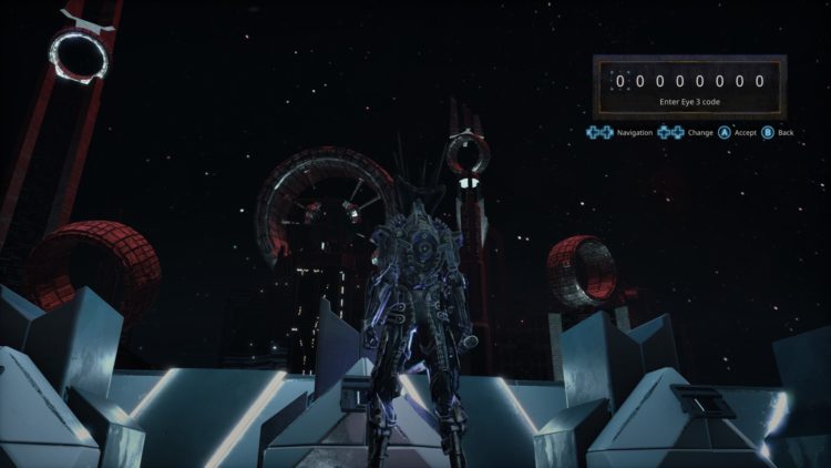Каждый код для глаза, найденный вами, состоит из 8 цифр и позволяет передвигать соответствующие башни. Теперь взгляните на каждый глаз, чтобы понять, что здесь можно ввести такие же 8-значные коды. Идея заключается в том, что вы должны вводить два кода для двух глаз, связанные между собой. Но ввода кода недостаточно: придется также немного подождать, чтобы в данном регионе наступил «Час Черной дыры». Поскольку Ирид Ново вращается вокруг Черной дыры, то время влияет на ваше окружение. Вы можете ориентироваться по часам, расположенным в левом верхнем углу экрана.