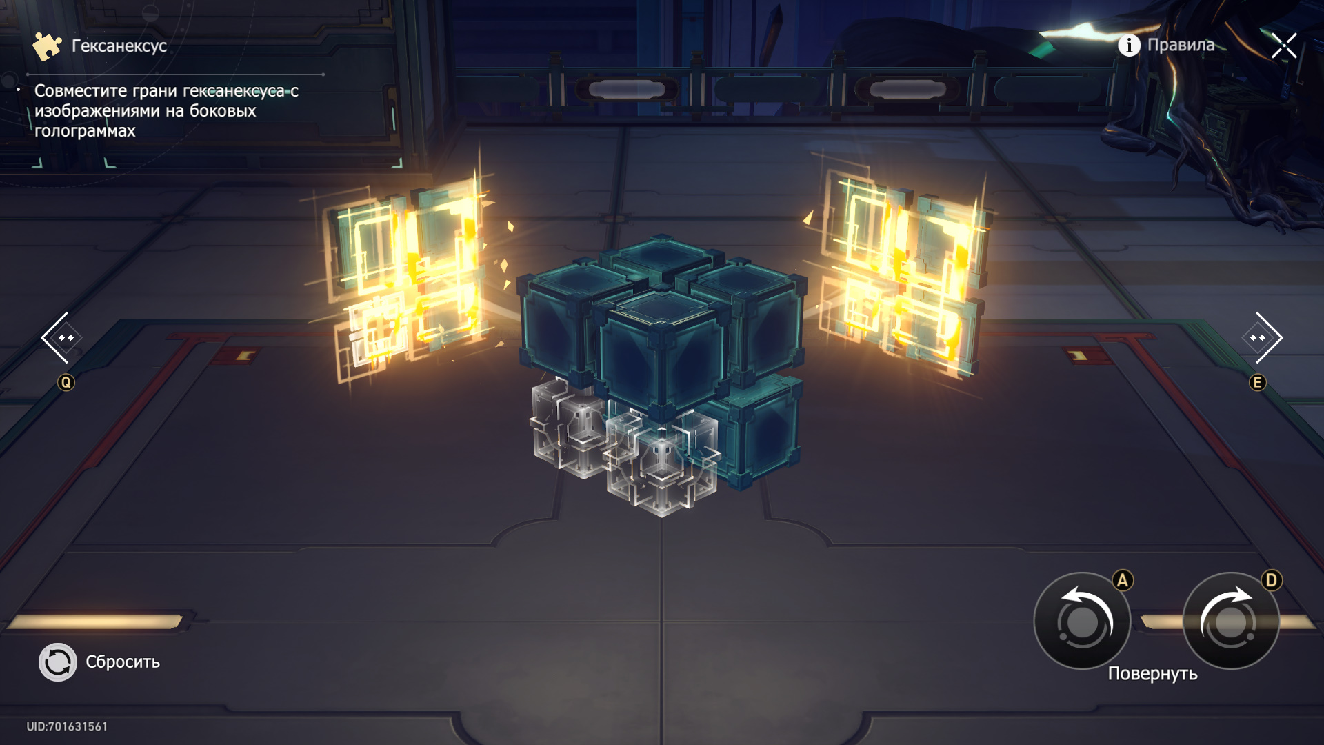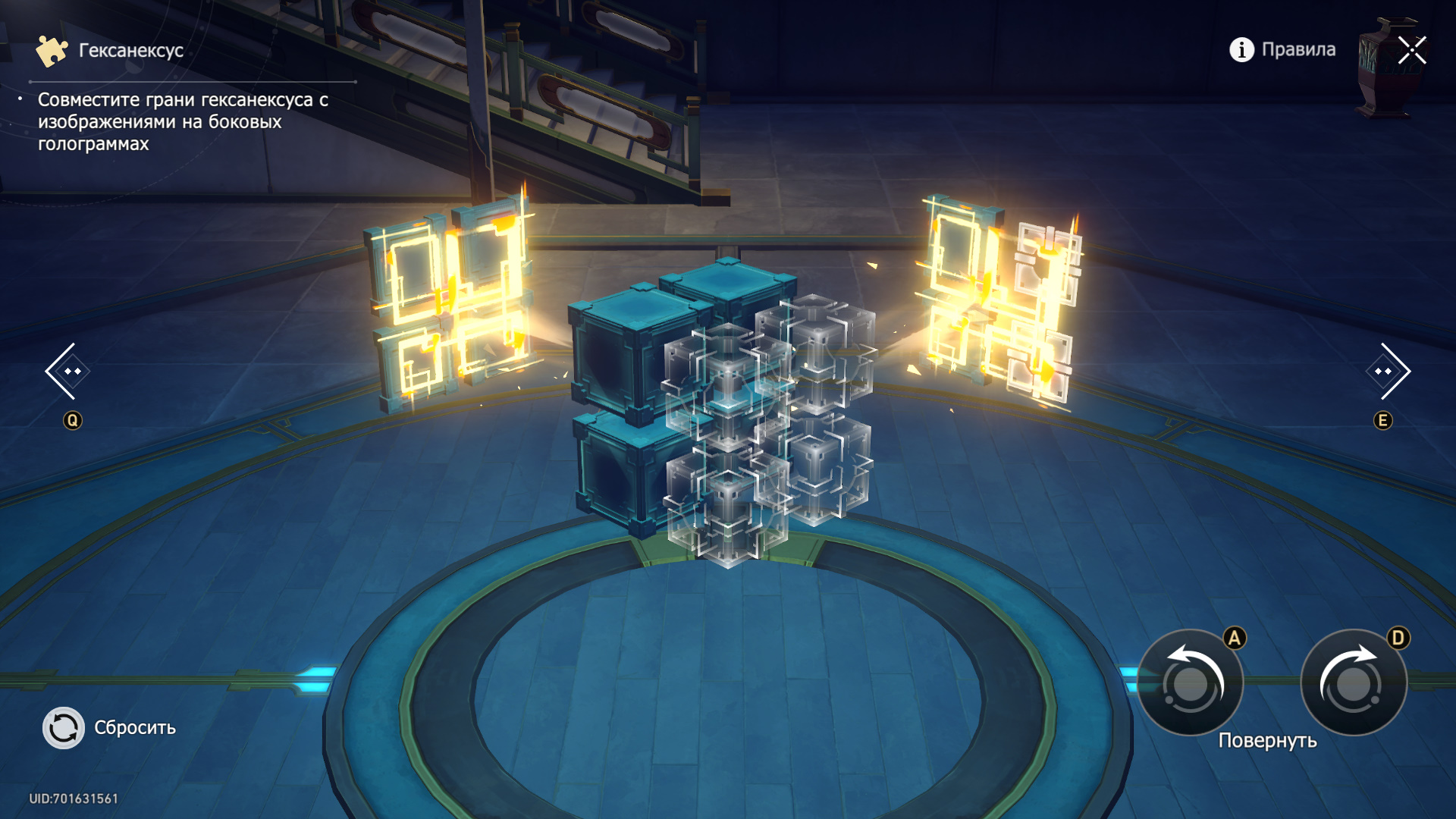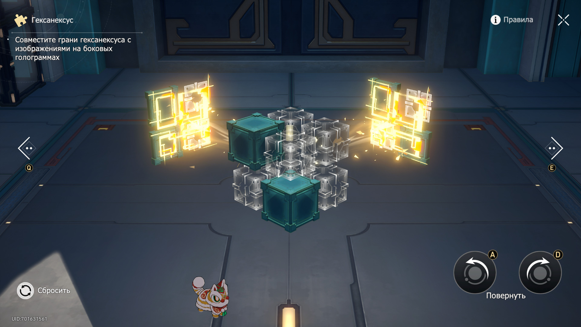 Идите в противоположную сторону и разберитесь с двумя другими вражескими группами. С левой стороны будет пазл Гексанексус. Сначала выберите последнюю правую кнопку, чтобы выбрать четыре правых боковых куба. Поверните один раз по часовой стрелке (клавиша D). Нажмите на первую кнопку слева, чтобы выбрать верхние кубы, и поверните их один раз по часовой стрелке. Нажмите на вторую кнопку сверху вниз с левой стороны, чтобы выбрать нижние кубы, и поверните один раз по часовой стрелке. Затем нажмите на вторую кнопку справа налево (внизу) и поверните кубы один раз по часовой стрелке. Все зеленые кубы должны оказаться снизу. Обыщите ценный сундук.