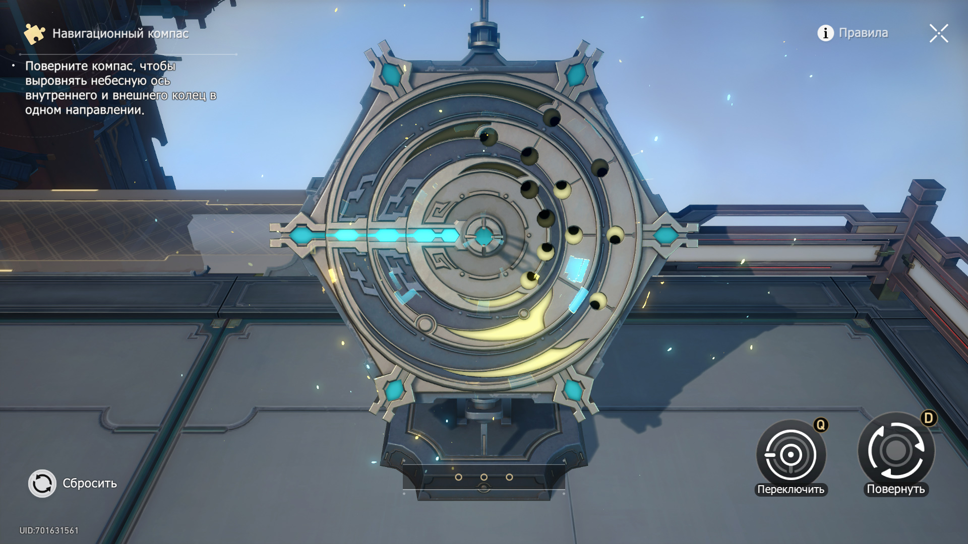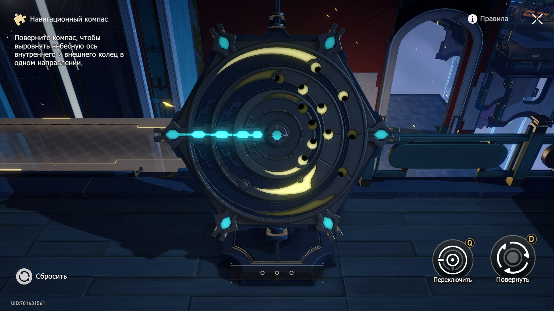 Вернитесь к телепорту и пройдите в другую сторону, чтобы отыскать Навигационный компас. Выберите внутреннее и внешнее кольца и поверните один раз (если не ошибаюсь; если не получится, тогда — два раза). Затем выберите внутреннее и среднее кольца и поверните четыре раза. Откройте ценный сундук.