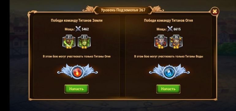 Однако будут встречаться комнаты (обычно те, что кратны 10), в которых вражеская группа состоит из Титанов разного типа. И в таком случае игра позволит вам выбрать любых Титанов. Чтобы уменьшить потери, проанализируйте состав противника и подберите наиболее оптимальную и сбалансированную команду. К примеру, следует избегать применения огненных титанов, если вражеская группа состоит из титанов воды и земли.
