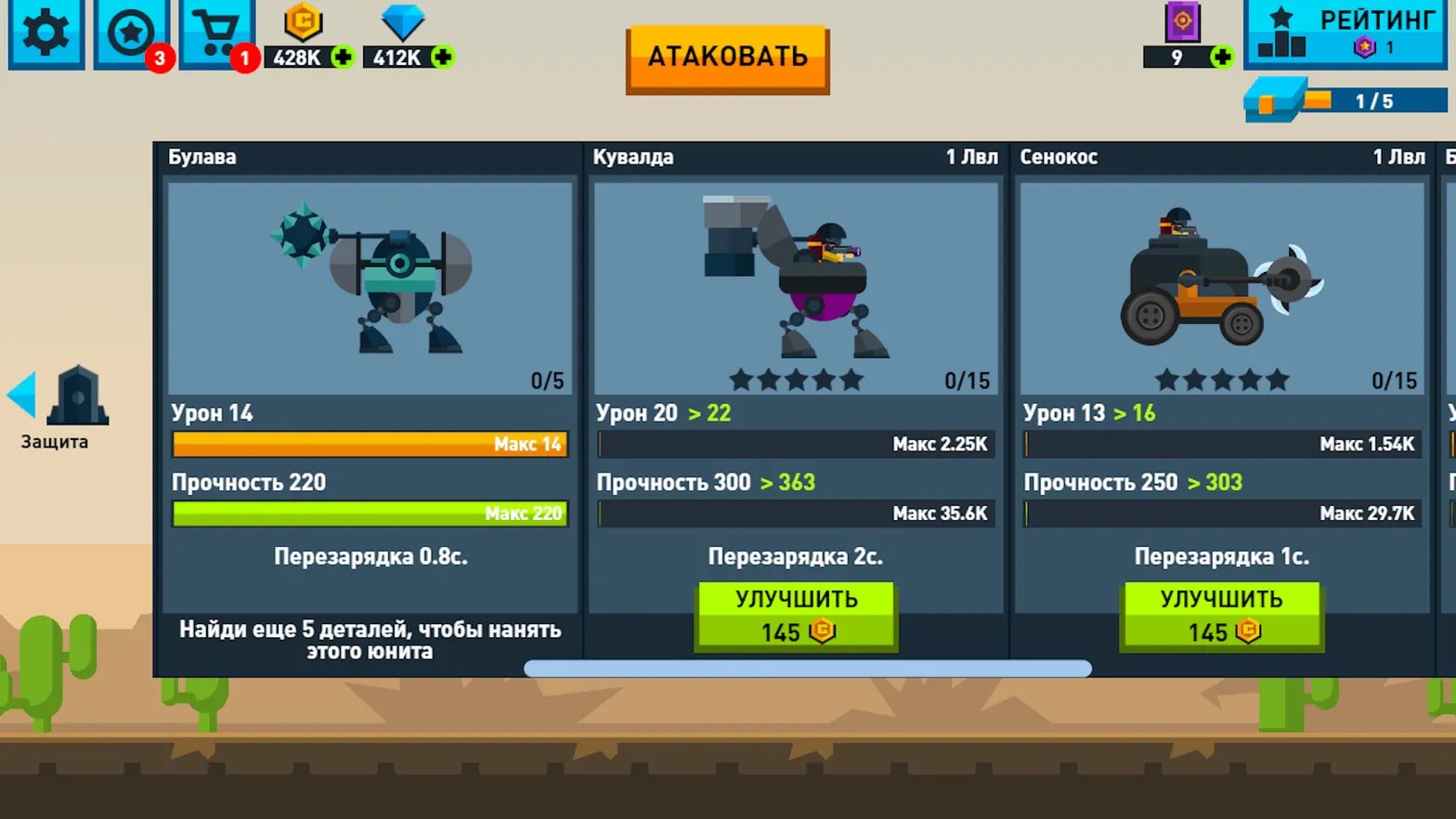 В атаку можно взять только семь юнитов. Не гонитесь за одним типом бойцов. Создавайте сбалансированную команду: воины ближнего боя, летающие юниты и быстрые машины. Собирайте «частички» для открытия новых типов юнитов, выполняя задания и сражаясь.