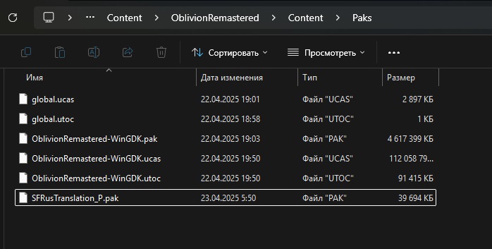 Обладателям Steam-версии следует переместить файл SFRusTranslation_P.pak в папку steamappscommonOblivionRemastered. Еще ниже по иерархии идти не нужно!