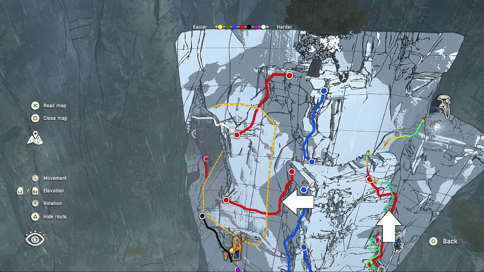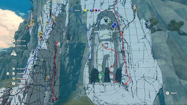 С этого выступа можно найти еще один вариант подъема по стене, чтобы попасть на более высокий уступ. Если наложите карту, увидите ведущий вверх красный маршрут. Поднявшись, спуститесь по веревке и пройдите по второму красному маршруту, ведущему обратно в Скальную пещеру, к небольшому высокому уступу, где можно найти первую часть куклы. Хронологически, если следовали нашему гайду, она станет для вас последней.