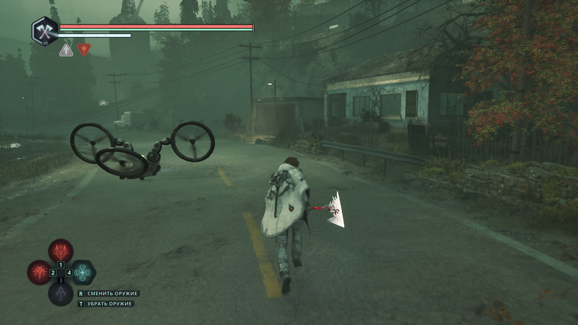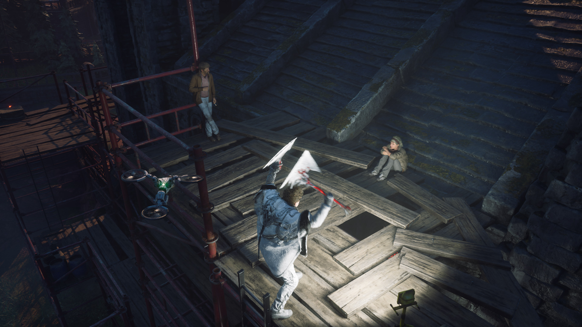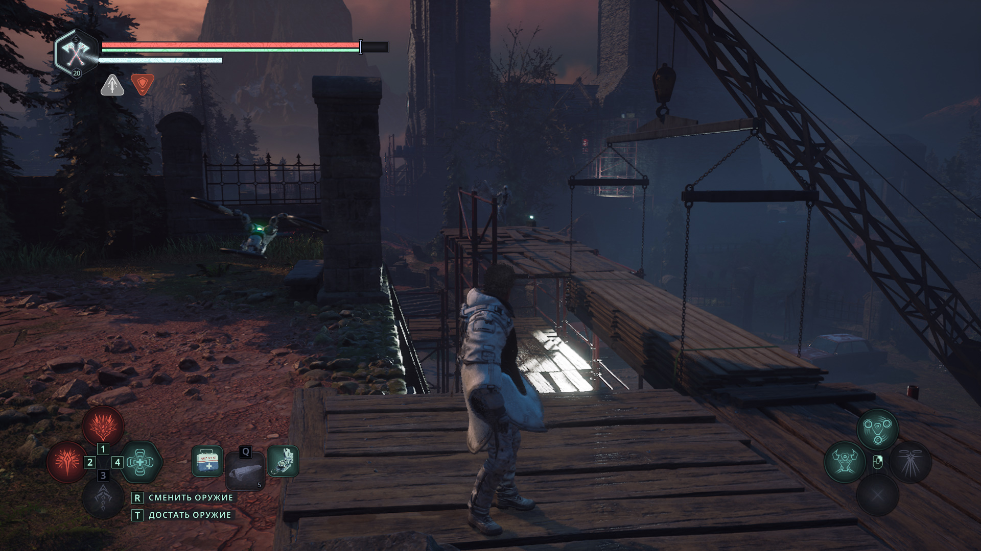 Вернитесь туда, где поворачивали последние статуи (у подъемного крана). Вновь используйте кран, чтобы поднять мостик вверх. Пройдите на территорию склепа со статуями через теперь уже открывшиеся ворота. Следуйте на строительные леса и убейте монстра вверху, который стреляет издали. Если зачистили локацию снизу и площадку неподалеку, парень с крыши поблагодарит, а благое дело «Разделенные» будет совершено. Также можете подобрать кепку «Квебек».