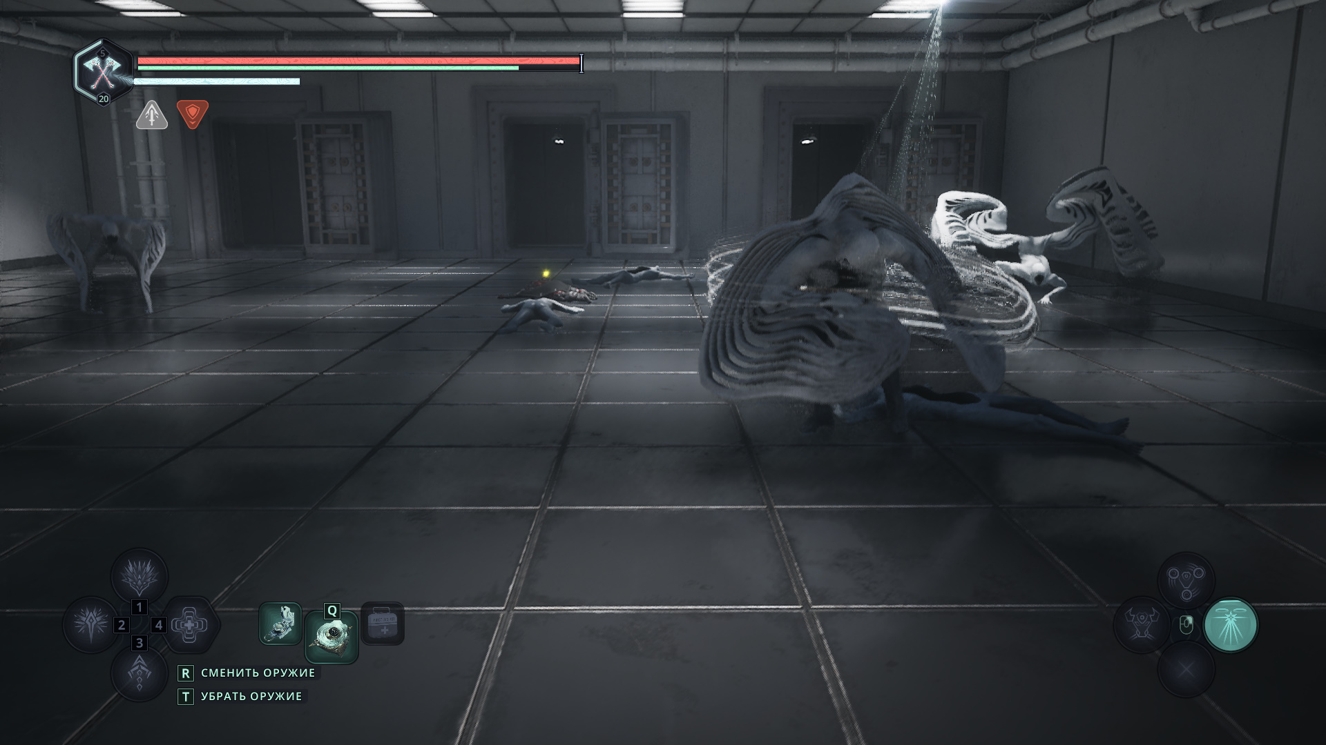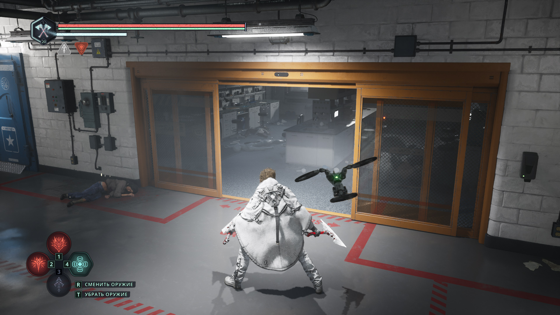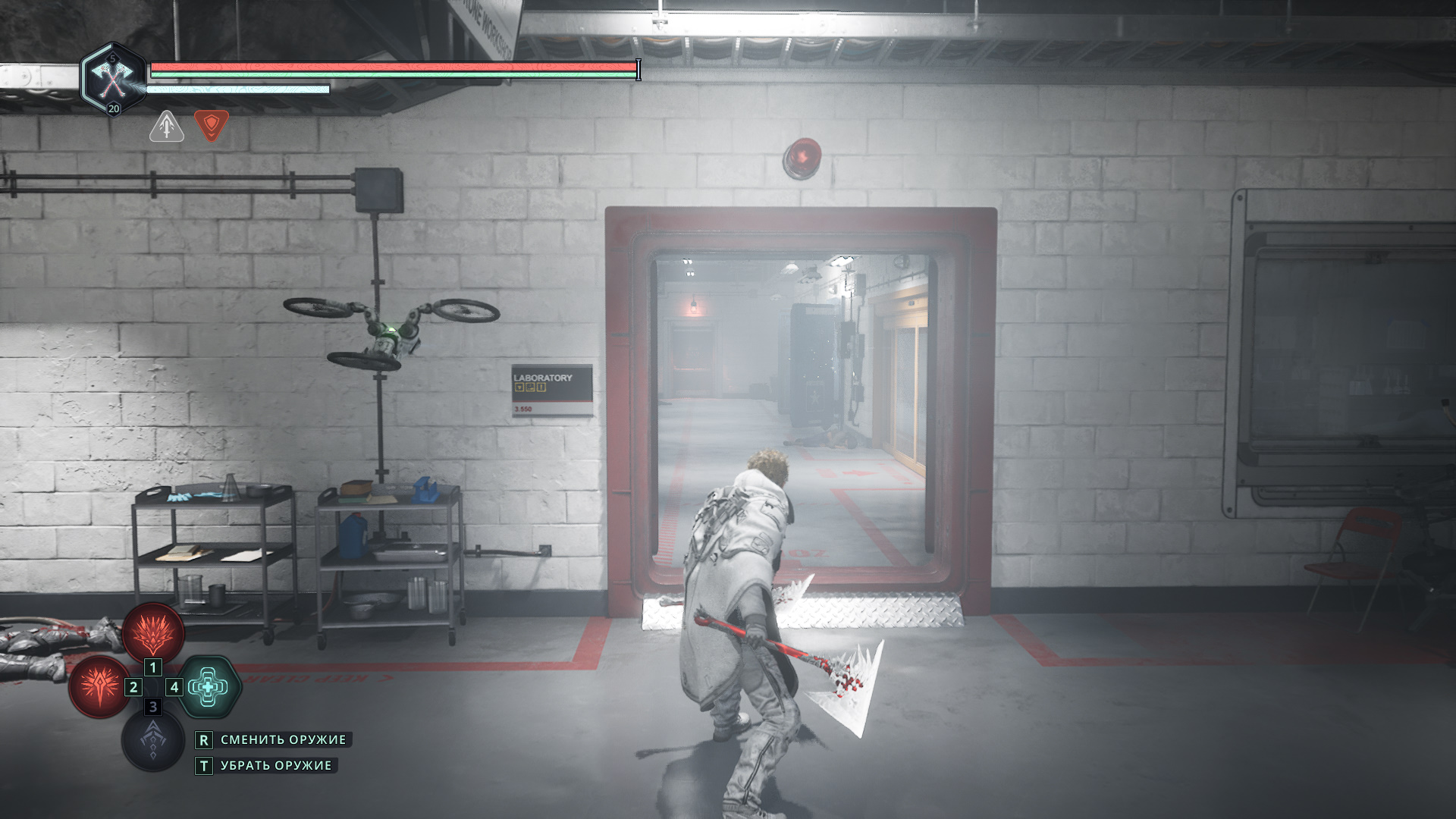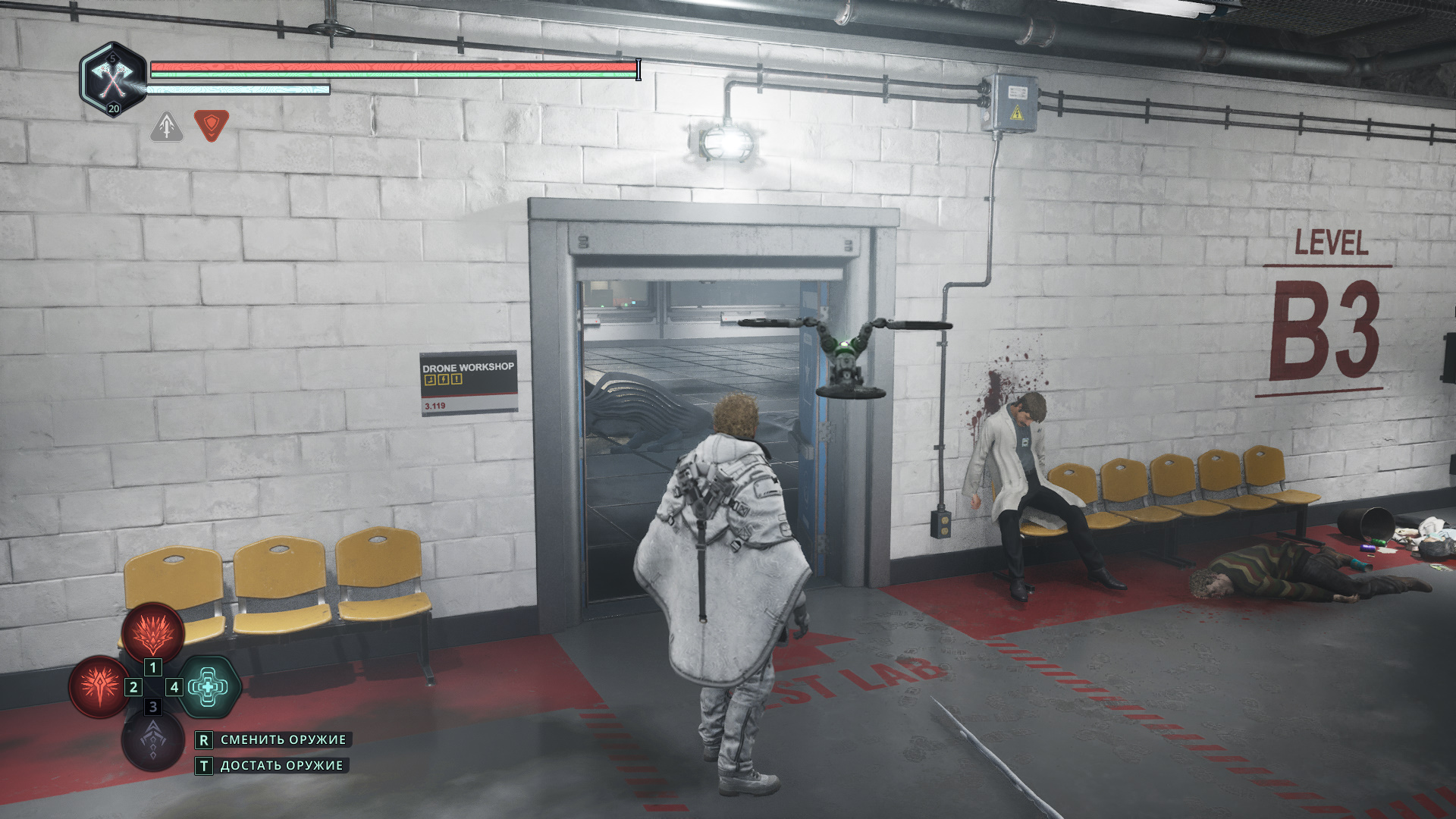 Рядом есть дверь с кодовым замком, но пароль вам неизвестен. В средней камере справа, где якобы были монстры, есть труп с коробкой патронов (предмет для исследования). С активированной синей сетью идите назад в начало B3, где была женщина и шкафчик. По пути в лаборатории открылась синяя дверь. Убейте всех врагов, чтобы уничтожить Стража временной петли.