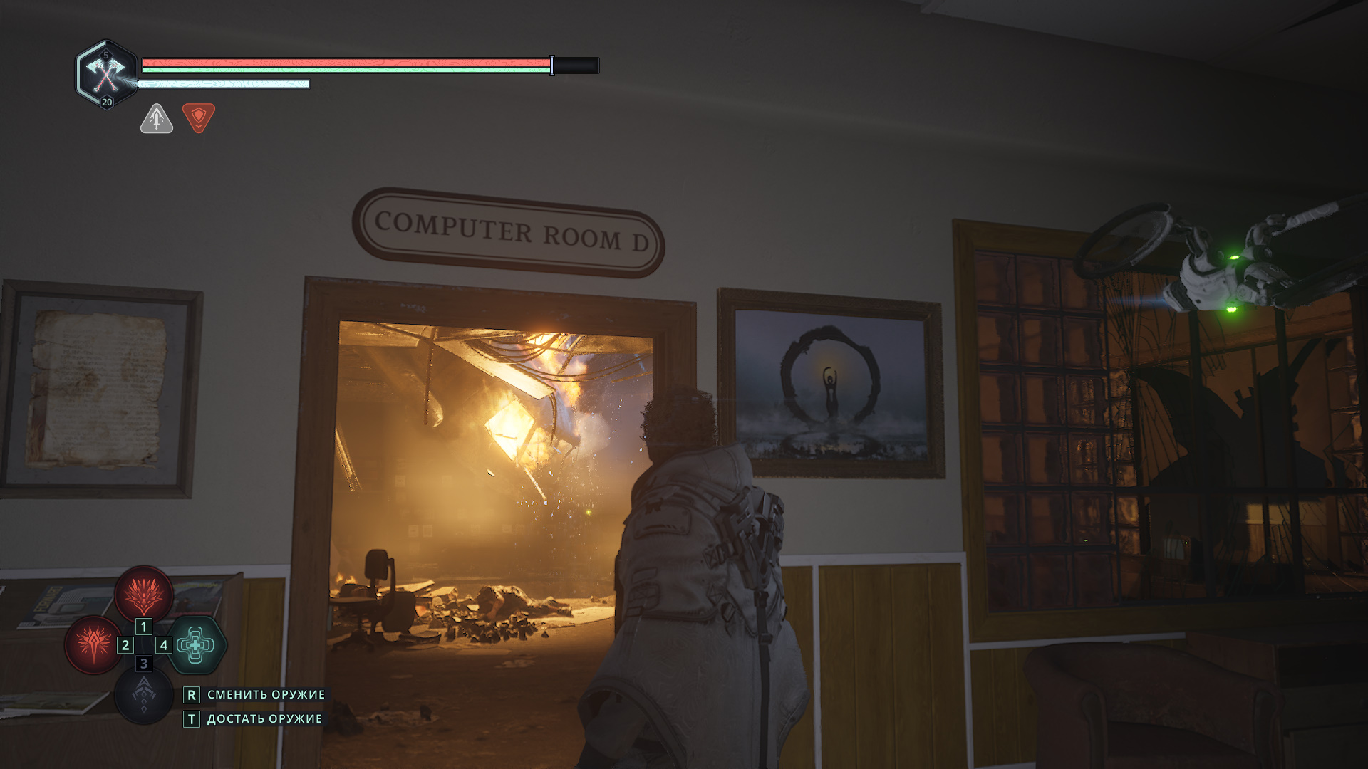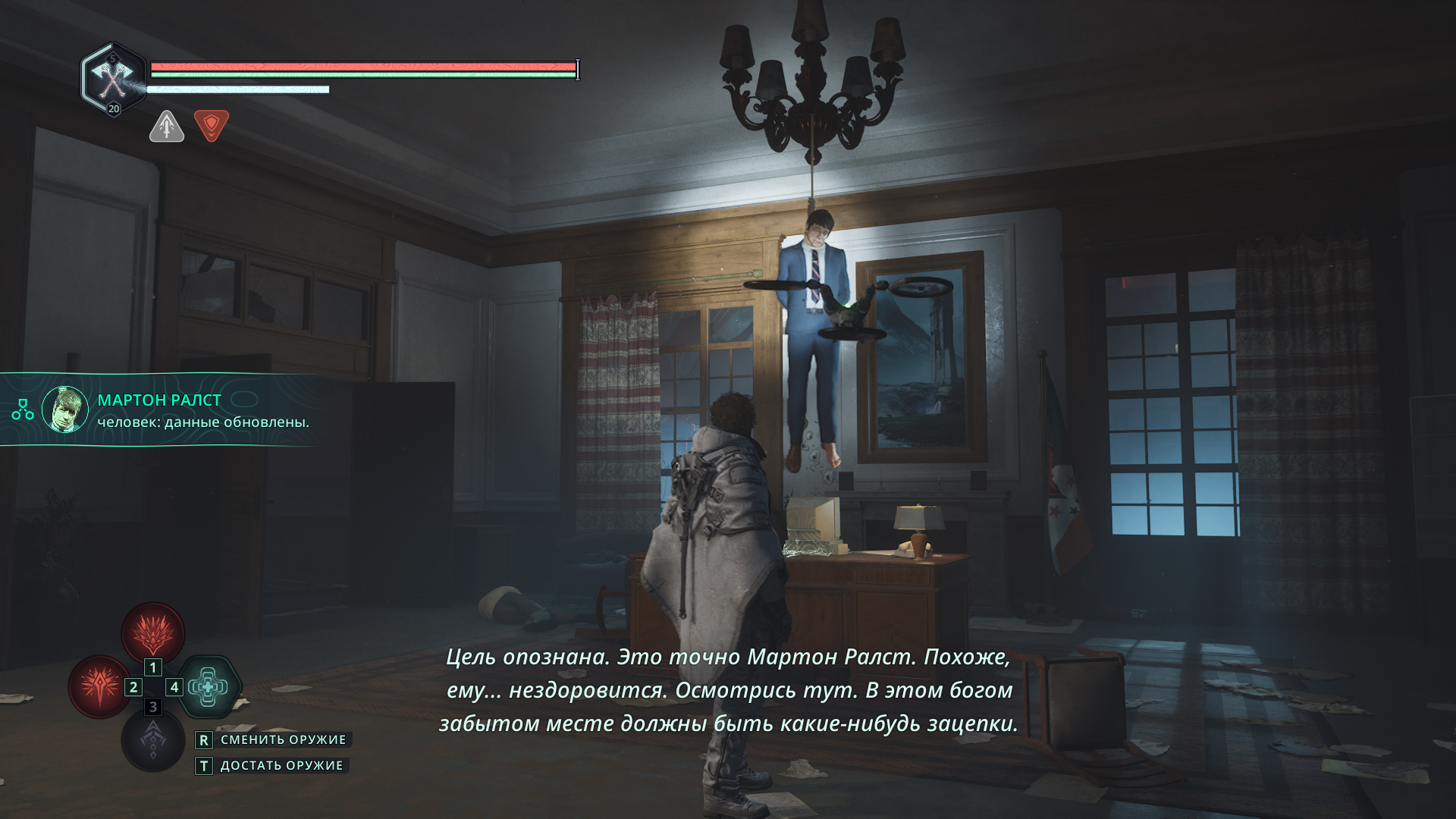 Вернитесь, пройдите через дверь, куда целятся миротворцы. Под лестницей ищите кепку «Гнев». Поднимитесь на верхний этаж и пройдите в офисы. В столе справа, на котором лежит труп клерка, ищите сожженные документы (предмет для исследования). Пройдите в следующее помещение и увидите повешенного Мартона Ралста. Изучите его компьютер. Нужен 3-значный код. Год с портрета напротив не подходит.