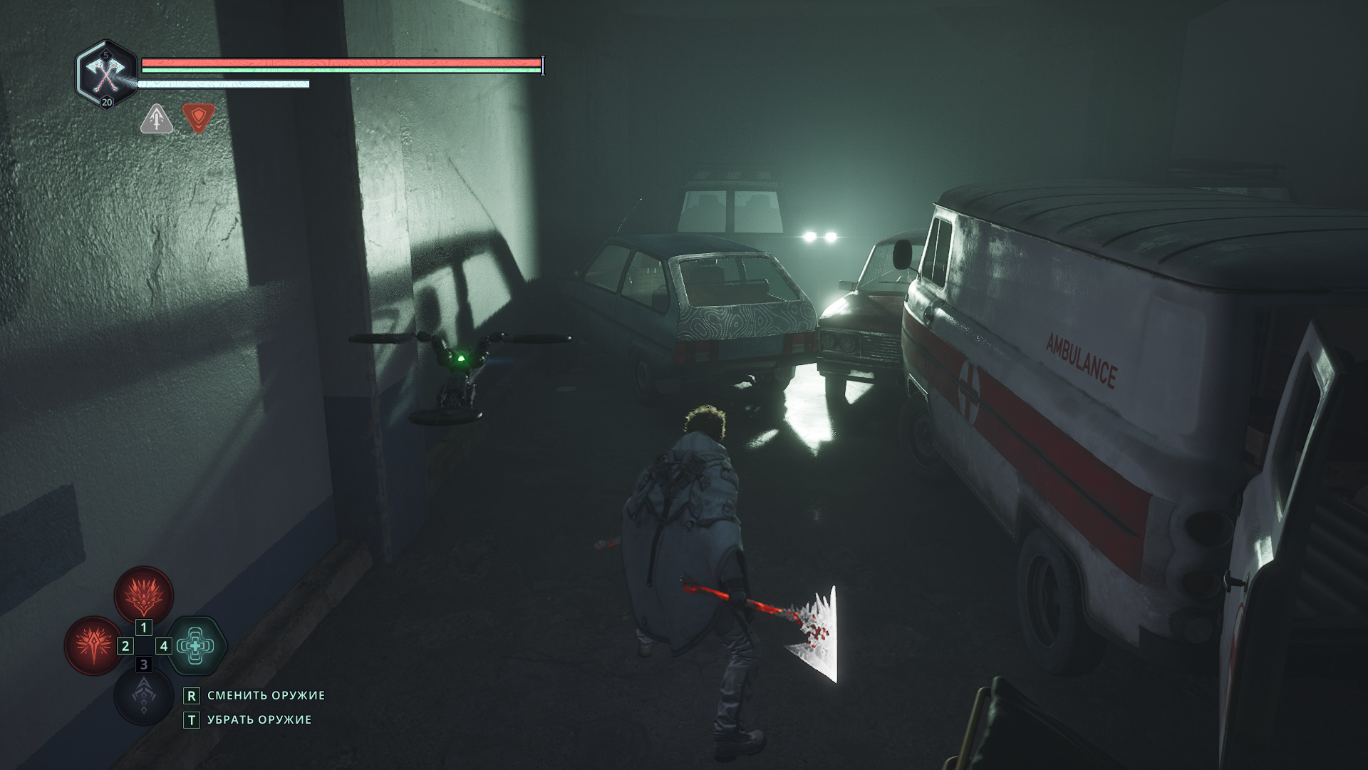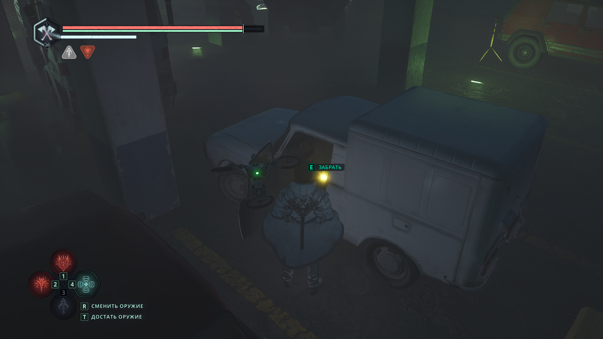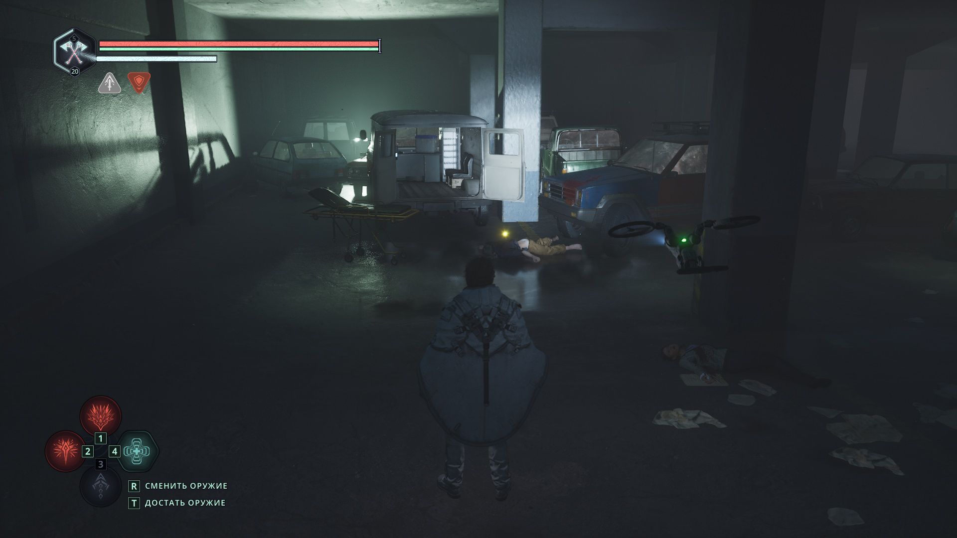 Он скажет, что на парковке находится его машина, но путь к ней преграждают монстры. Для завершения благого дела их придется убить. Переберитесь по крыше на другую сторону и спуститесь по строительным лесам на закрытую территорию. Около трупа лежат ключи от подъемного крана.
