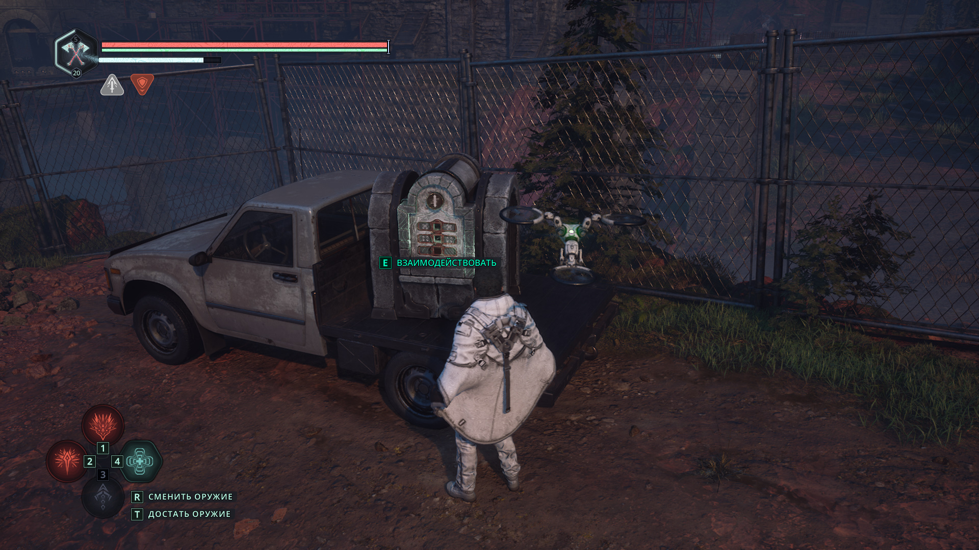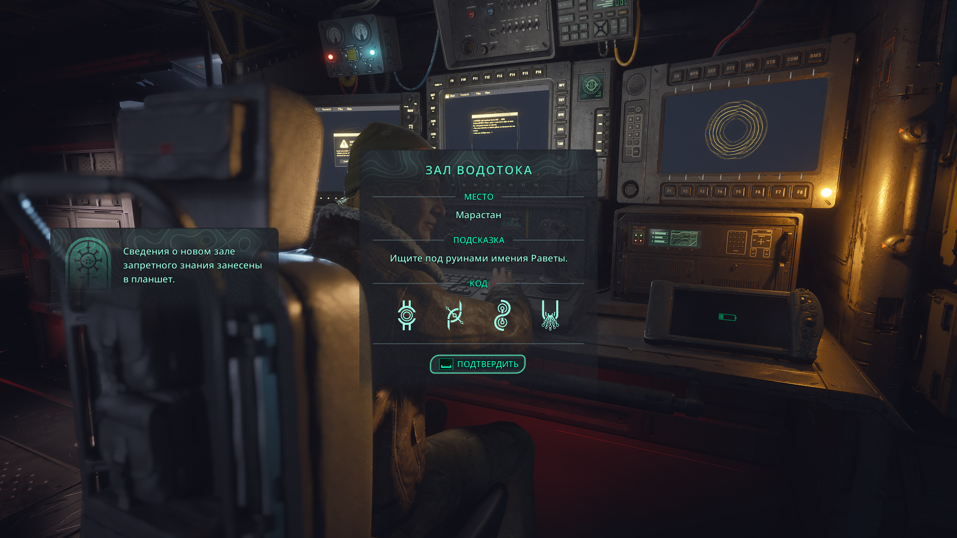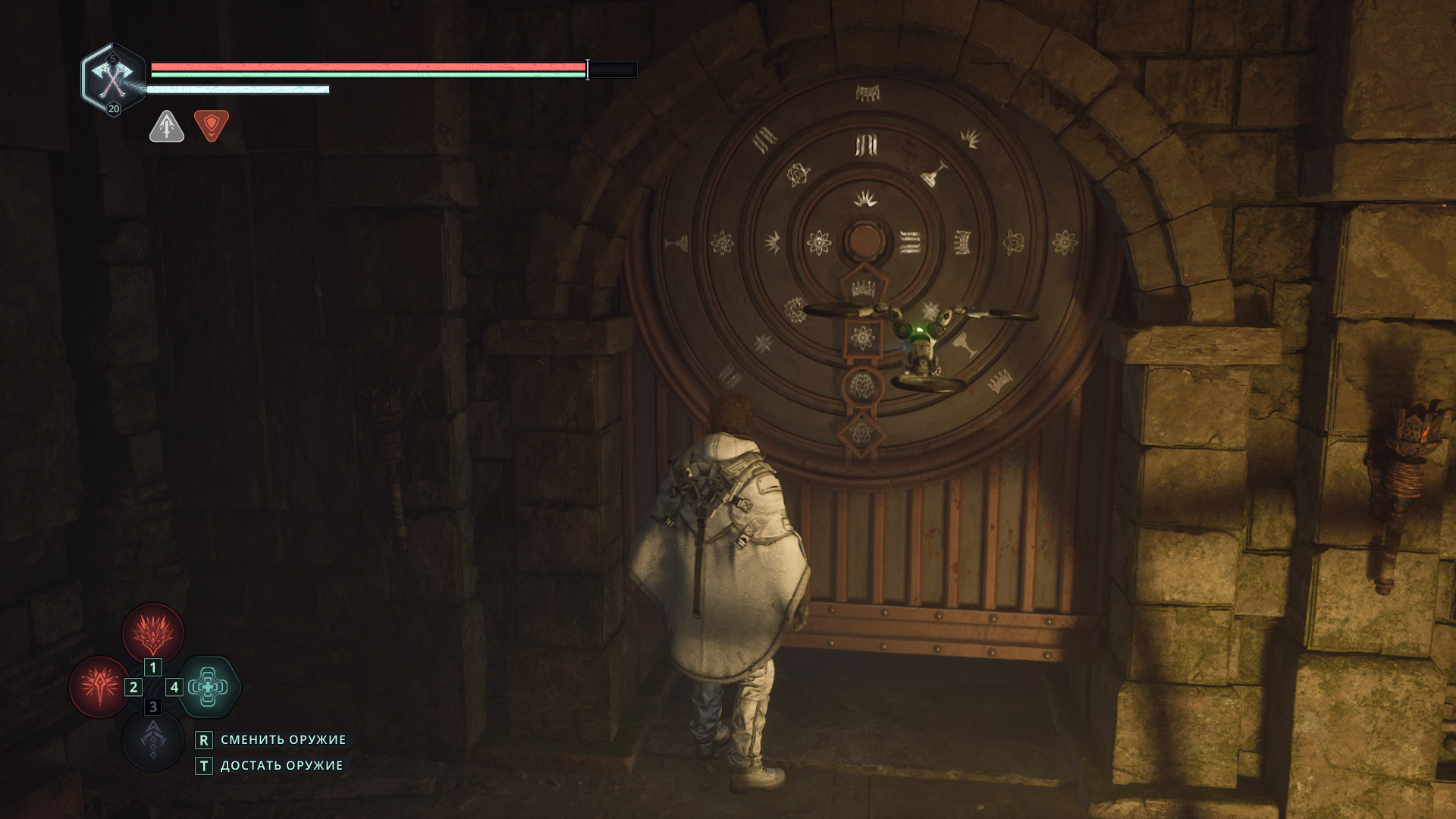 На алтаре лежит записка «Подрядчик». Выйдите через другую дверь и убейте второго Стража временной петли. Вы обнаружите беседку, слева и справа есть 12 дисков с символами и цифрами. Пока что код вам неизвестен.